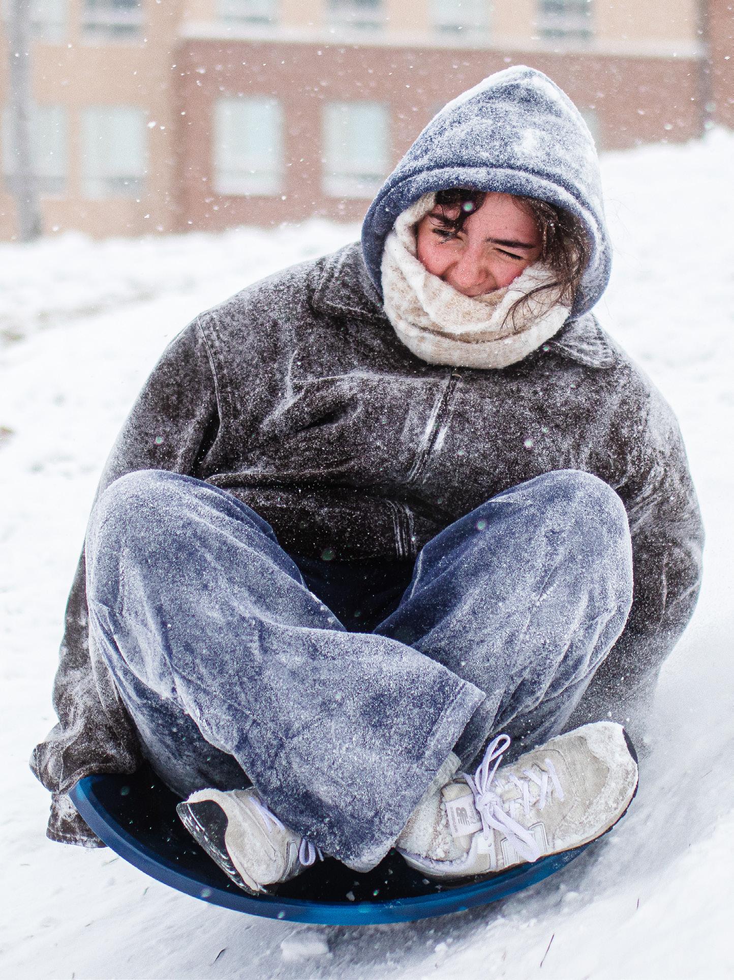 A student sleds down the hill between Shocker Hall and Charles Koch Arena. Many students and visitors came to sled, snowboard and slide down the hill. Photo by Zachary Ruth / The Sunflower