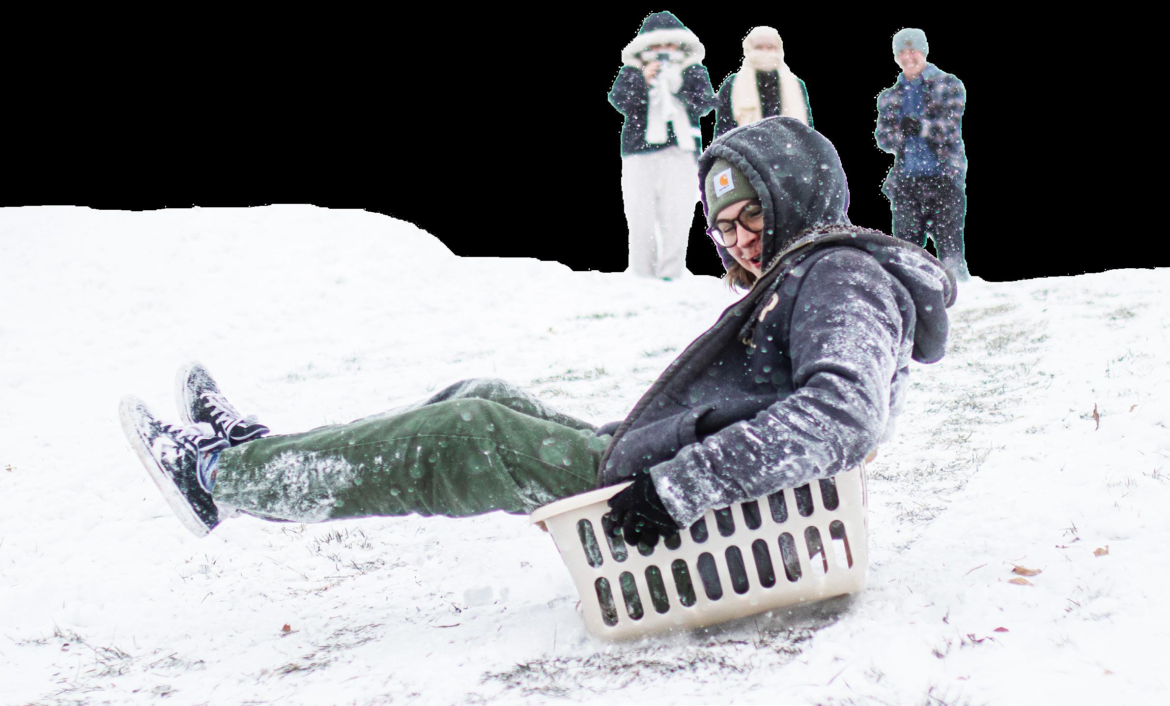 A student sleds down a hill in his roommate’s laundry basket on Saturday. Students used sleds, snowboards, boxes, tote lids and more to sled. Photo by Zachary Ruth / The Sunflower