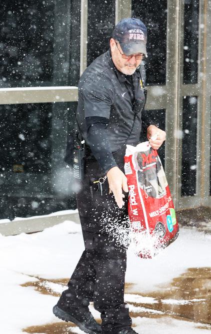 A member of The Wichita Fire Department throws salt on the sidewalk. Salt lowers the freezing point of water. Photo by Mack Smith / The Sunflower