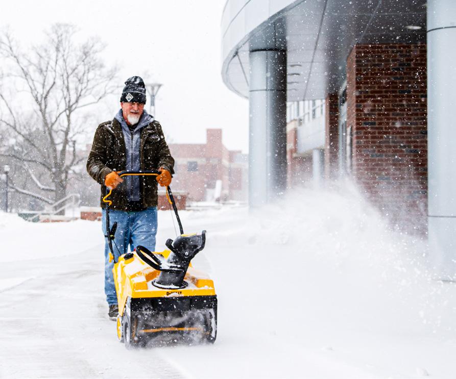 A university employee blows snow off the east patio of the RSC. Snow shovels, blowers and plows were used across campus to keep streets, sidewalks and parking lots open. Photo by Zachary Ruth / The Sunflower