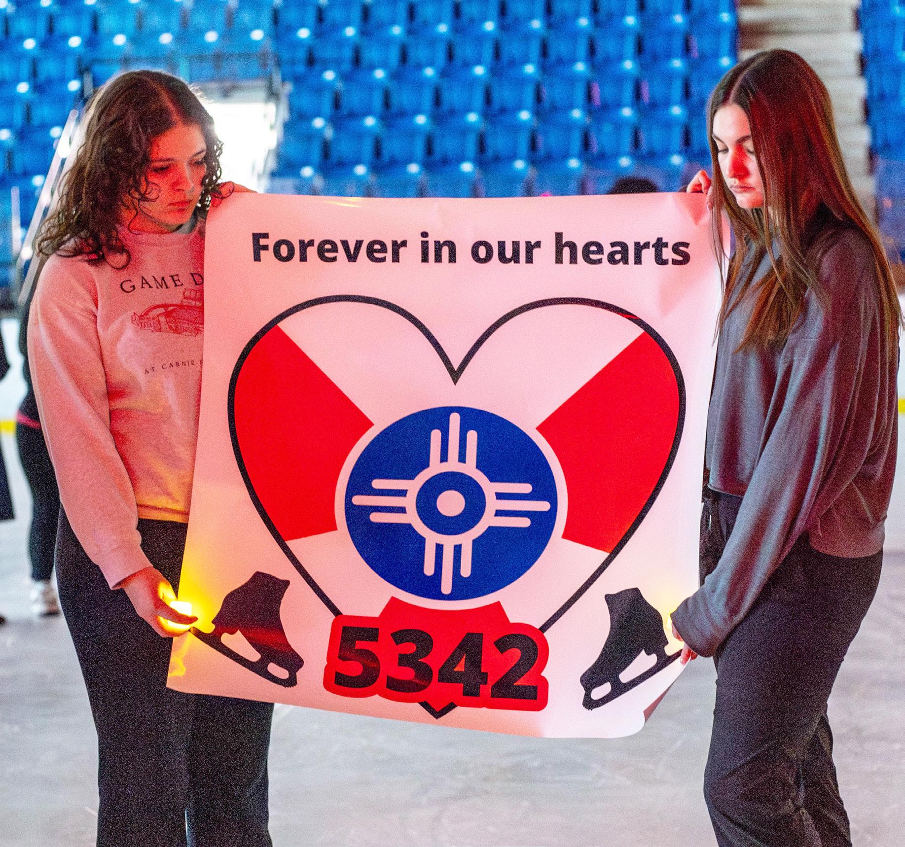 The Wichita Figure Skating Club held a memorial vigil and a moment of silence for the plane crash victims on Monday. New signs at the Wichita Ice Center facility with photos of some of the crash victims adorned the rink as affected Wichitans congregated with candles.