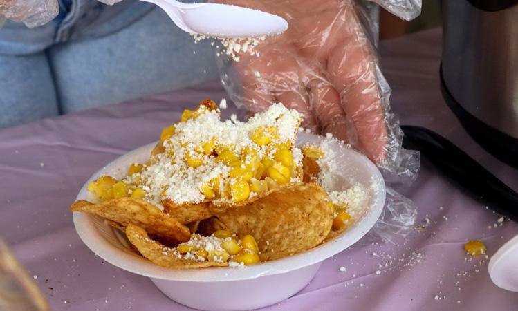 A Kappa Delta Chi sorority member prepares a tostielote for Wichita State students at the sorority’s fundraiser event on Sept. 21. | Photo by Garima Thapa / The Sunflower