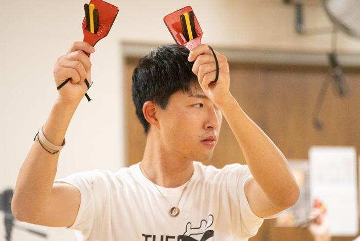 Sports Management student Ryotaro Ito practices Yosakoi dance with Naruko instrument. The dance workshop was on Sept. 22 in a Heskett Center dance room.