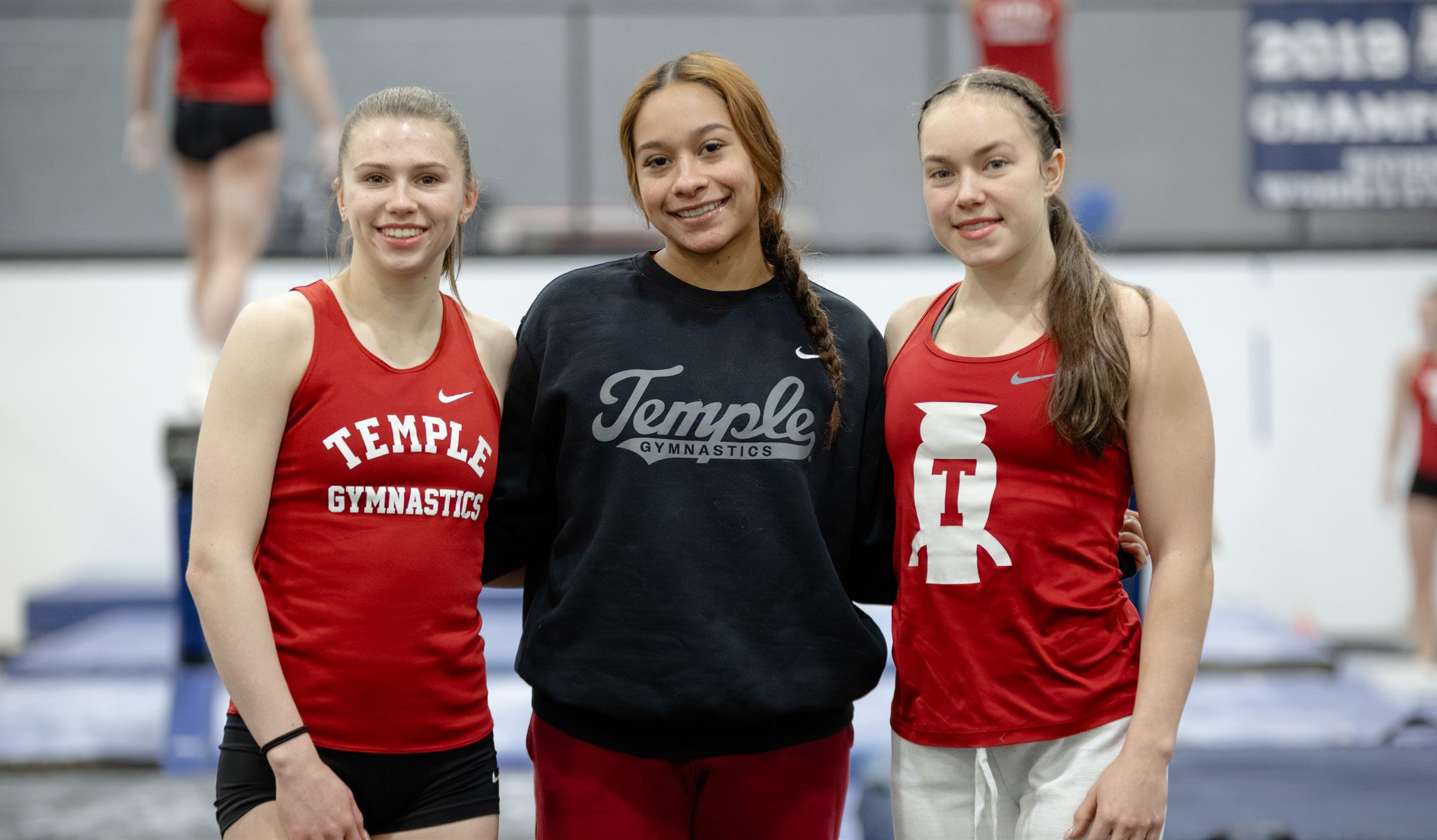 Young gymnasts and Temple mentors help each other with routines and stress.