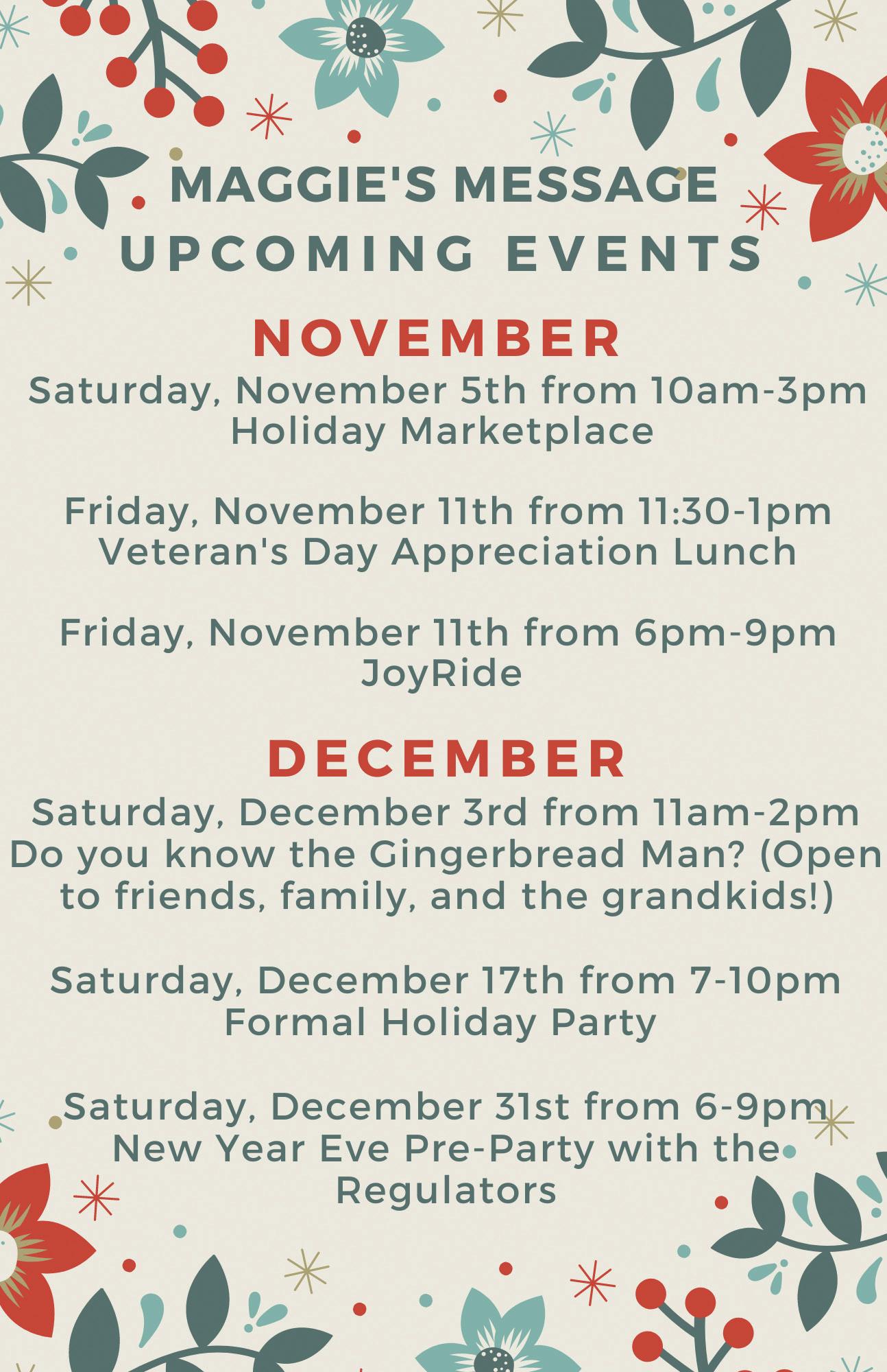 your neighbors for an evening of dancing and mingling the night away. Last but not least a warm-up to New Year’s Eve on December 31st from 5:30 – 8:30 in the Ballroom with the Regulators.