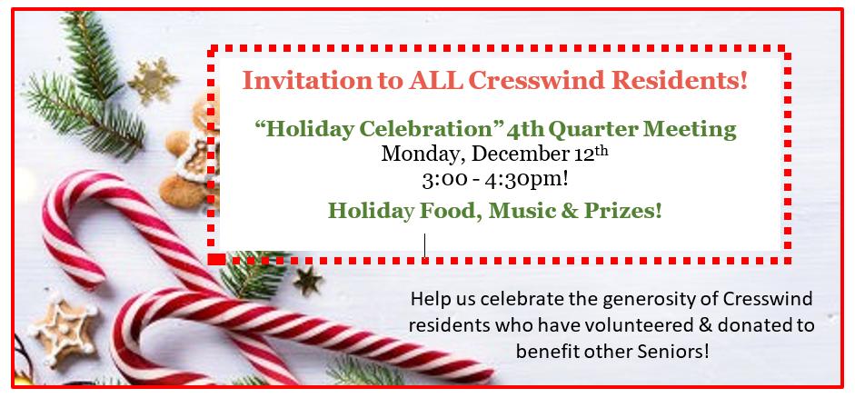 This year 2022 is waning away. It has been a good year of regaining a sense of normalcy following two years under the influence of Covid. As I write this, I am listening to the horrible reports of the impact Hurricane Ian is having on so many others. Some places most hard hit will have to create a new normal. I imagine most Cresswinders know of someone that was affected by that tragedy. I know of several myself. How quickly an otherwise “good year” changed for them.
