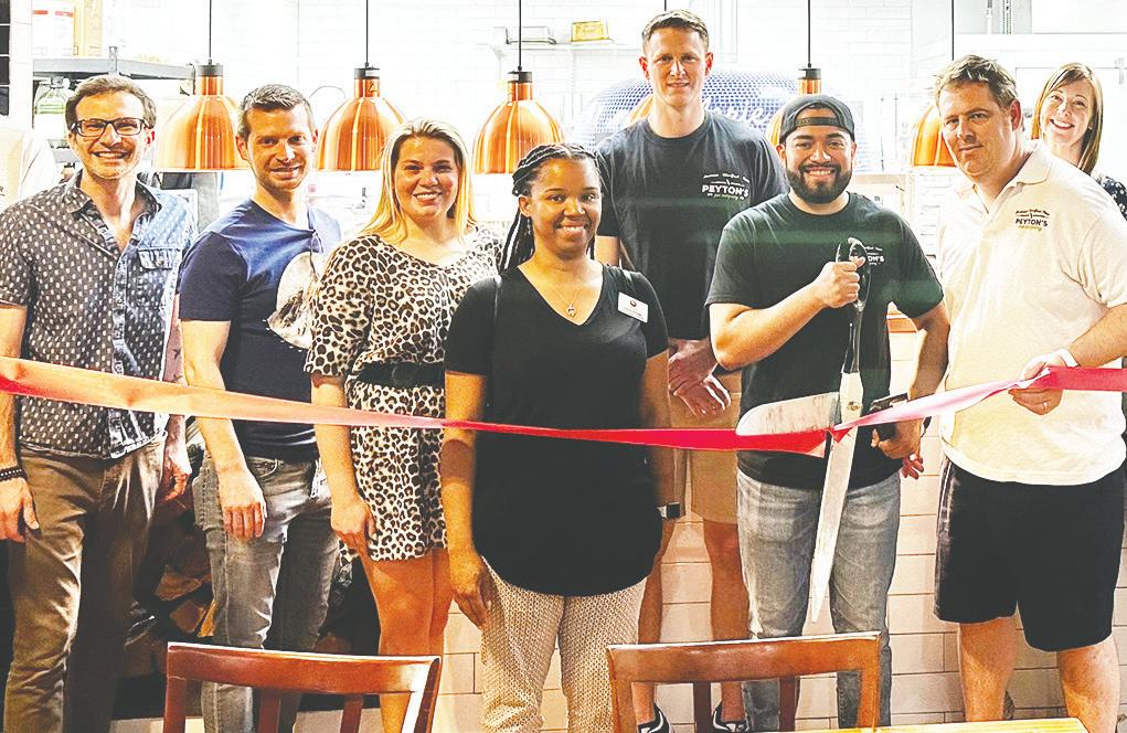 Roland Stanley, Arquimides "Archie" Pacheco and Nick St Clair cut a ribbon at Peyton's Pie Company at Main Street Market in Downtown Gainesville. A wood fire pizzeria, Peyton’s Pie's dough is cold aged for 36 hours, are artisan-sized, and cooked at 800 degrees with a slight
