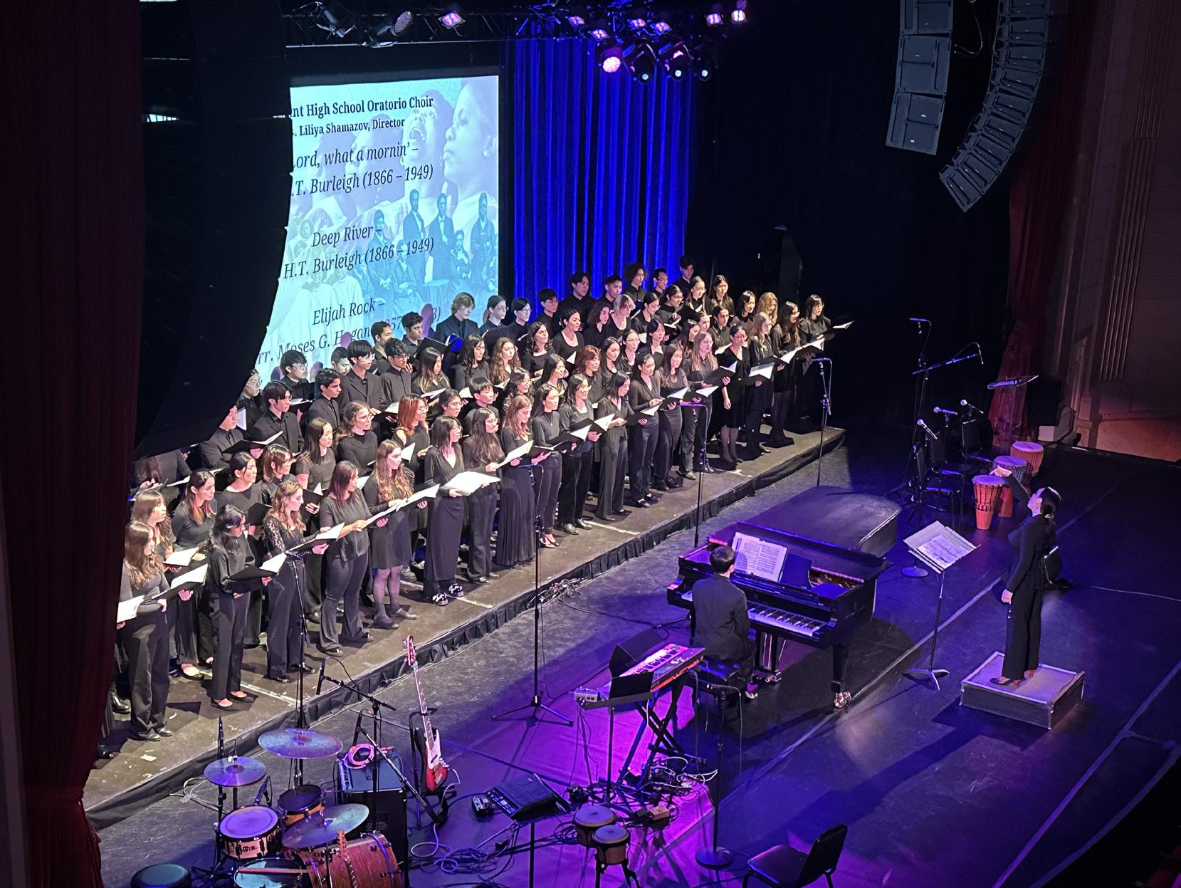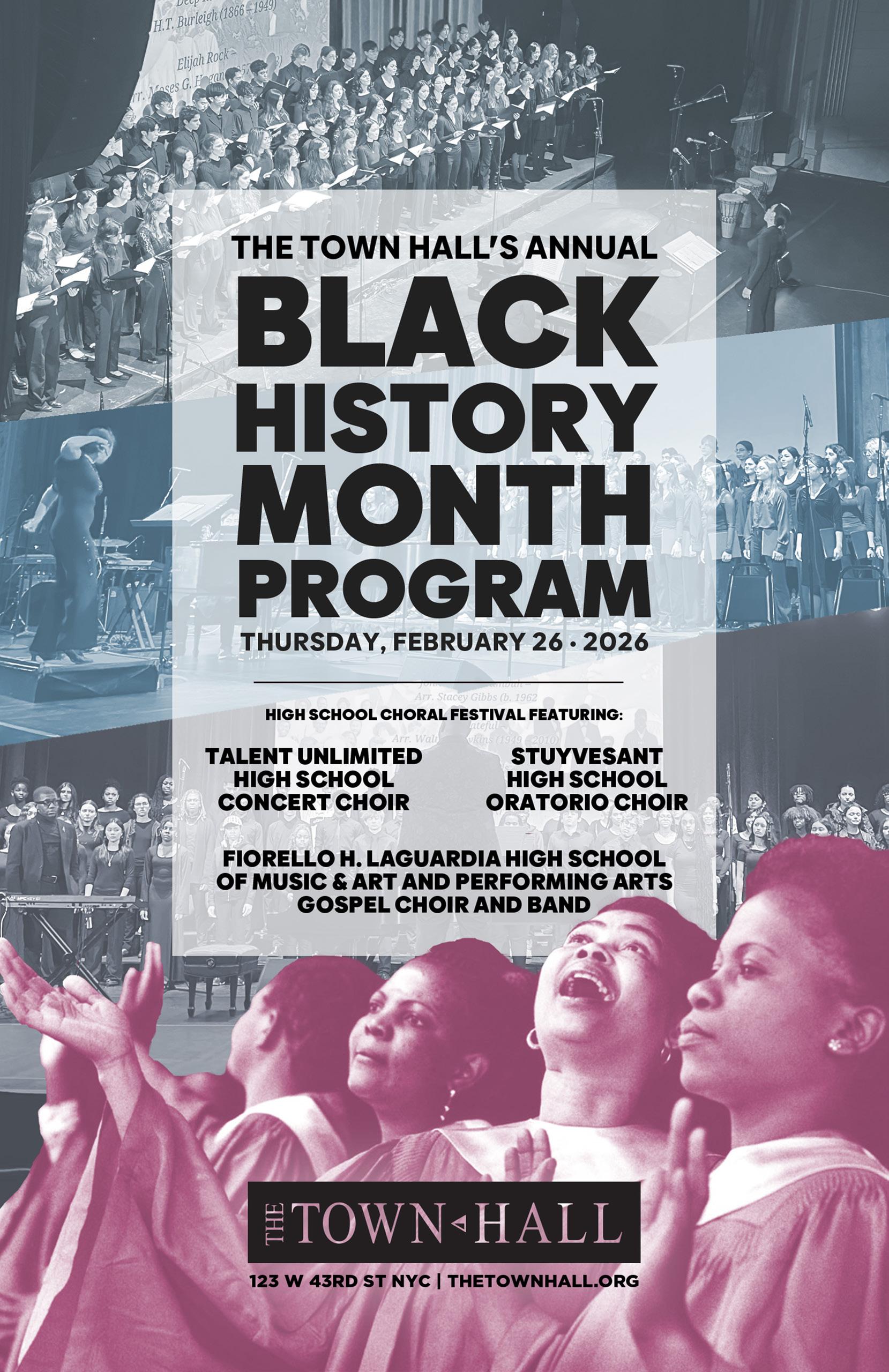 The Town Hall Black History Month Choral Festival features choirs from Fiorello H. LaGuardia High School of Music & Art and Performing Arts Gospel Choir and Band, Stuyvesant High School Oratorio Choir, and Talent Unlimited High School Concert Choir. This festival serves as a tool for students to learn the importance of Black choral music in the development of modern vocal music, and the reach of the contributions of Black composers and Black musical traditions not only in the history of the United States, but in the history of music worldwide.