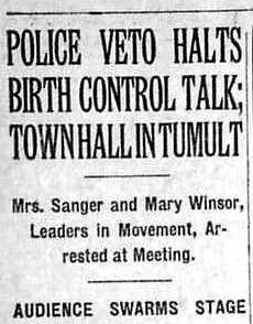 In 1921, Margaret Sanger came to Town Hall to speak to an audience about birth control , a very controversial subject at the time. Town Hall resisted pressure from church and city officials and was one of few venues that welcomed Margaret Sanger. However, her lecture was interrupted by police officers, who hauled Sanger offstage and arrested her. As police led her to the station in handcuffs, the audience followed, singing My Country Tis of Thee. The incident made headlines and brought in big donations for Sanger’s small organization, which years later was renamed Planned Parenthood .