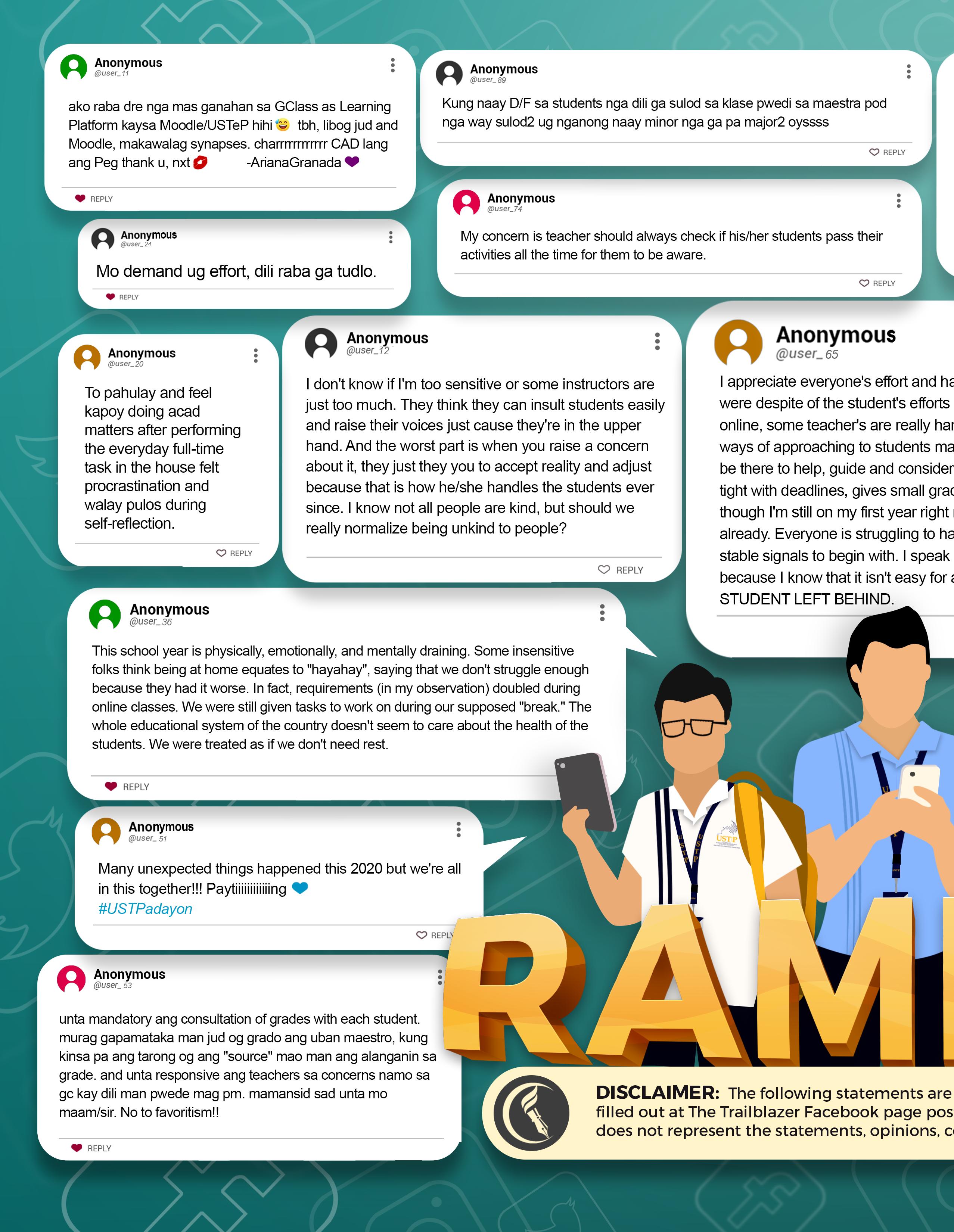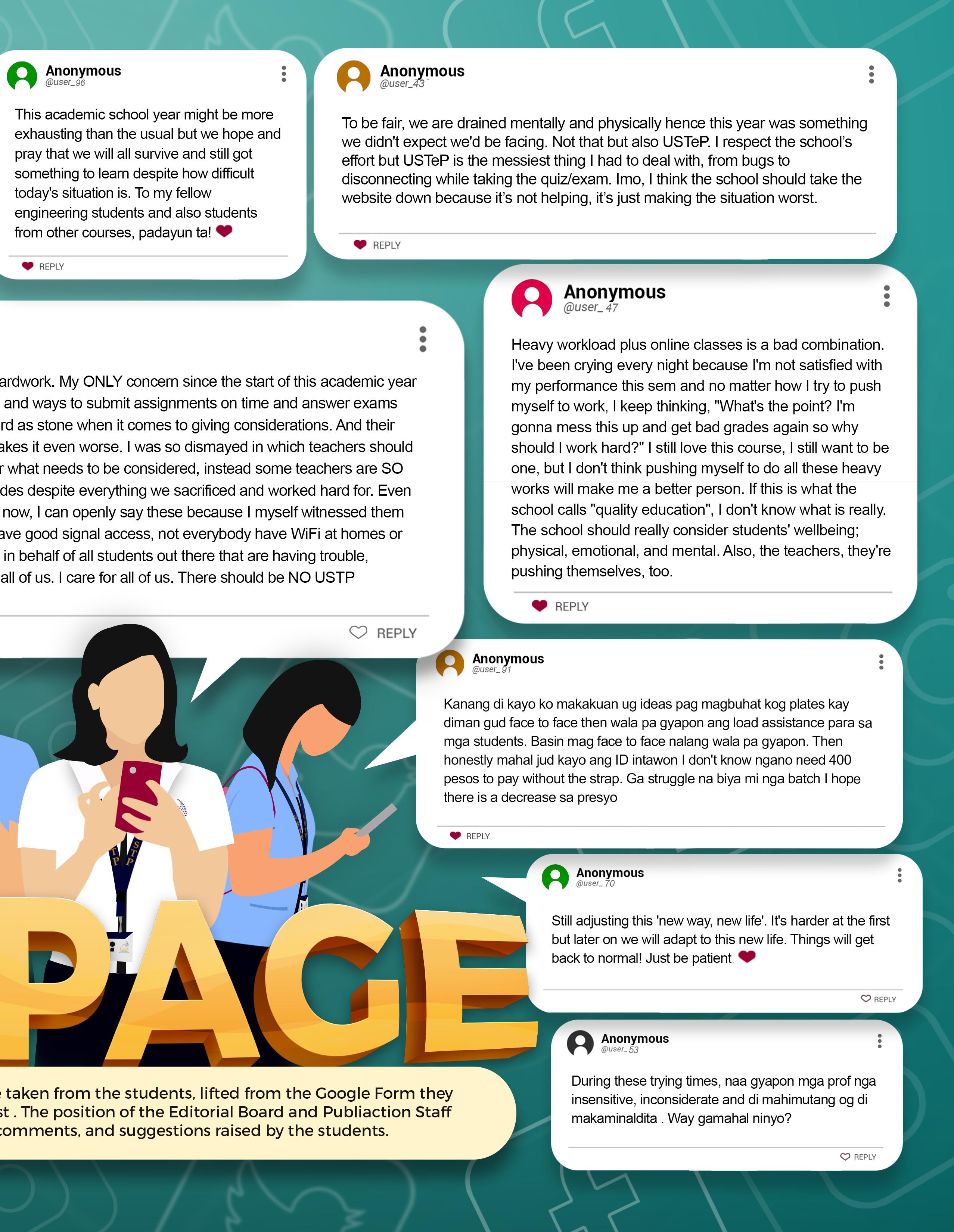 The intrinsic nature of education is somehow challenged as students, instructors, and involved sectors continue to adapt in the flexible mode of learning. As scholarly institutions pursue its conveyance of necessary adjustments, a rising wave of concerns also manifest. In an interview with the Head of Office of Student Affairs (OSA) Guidance Services Unit, Mrs. Mercylyn Tanog stated that “The common troubles of students pertain to familial issues, fear of uncertainties, financial issues relating to a lack of gadgetsandreliableinternetconnection.”All of which complicate their endeavours to perform academic tasks. As students face a growing pile of assigned outputs, the definition of meaningful learning is also called into question. The administration was also prone to receiving an outpour of criticism during the onset of the academic year. Consequently, the time for self-care has been cut short and the need for time-management is further emphasized. During this drastic change of pace, misperceptions have been normalized while feelings of self-worth are prospectively lost.