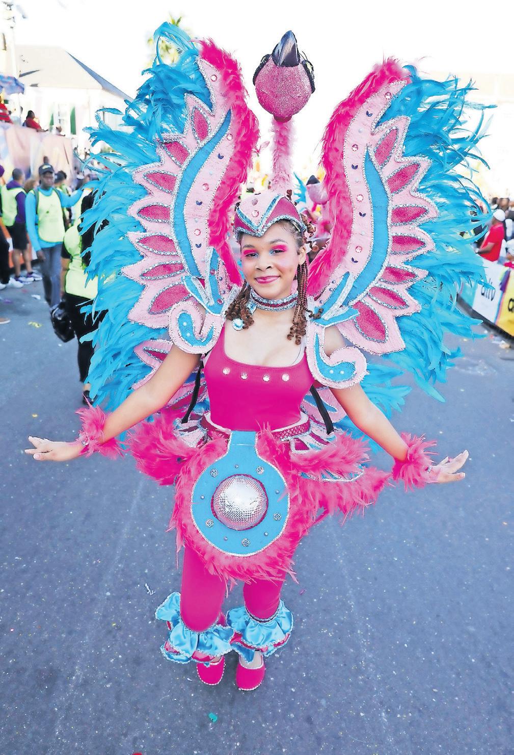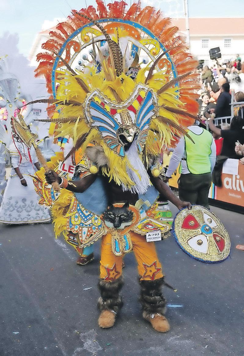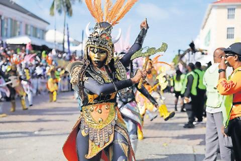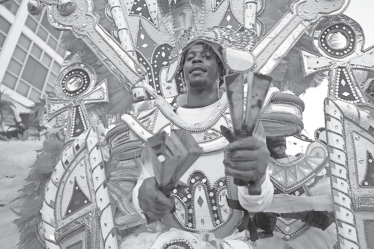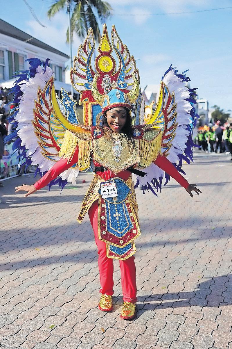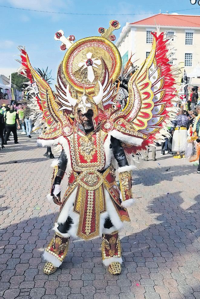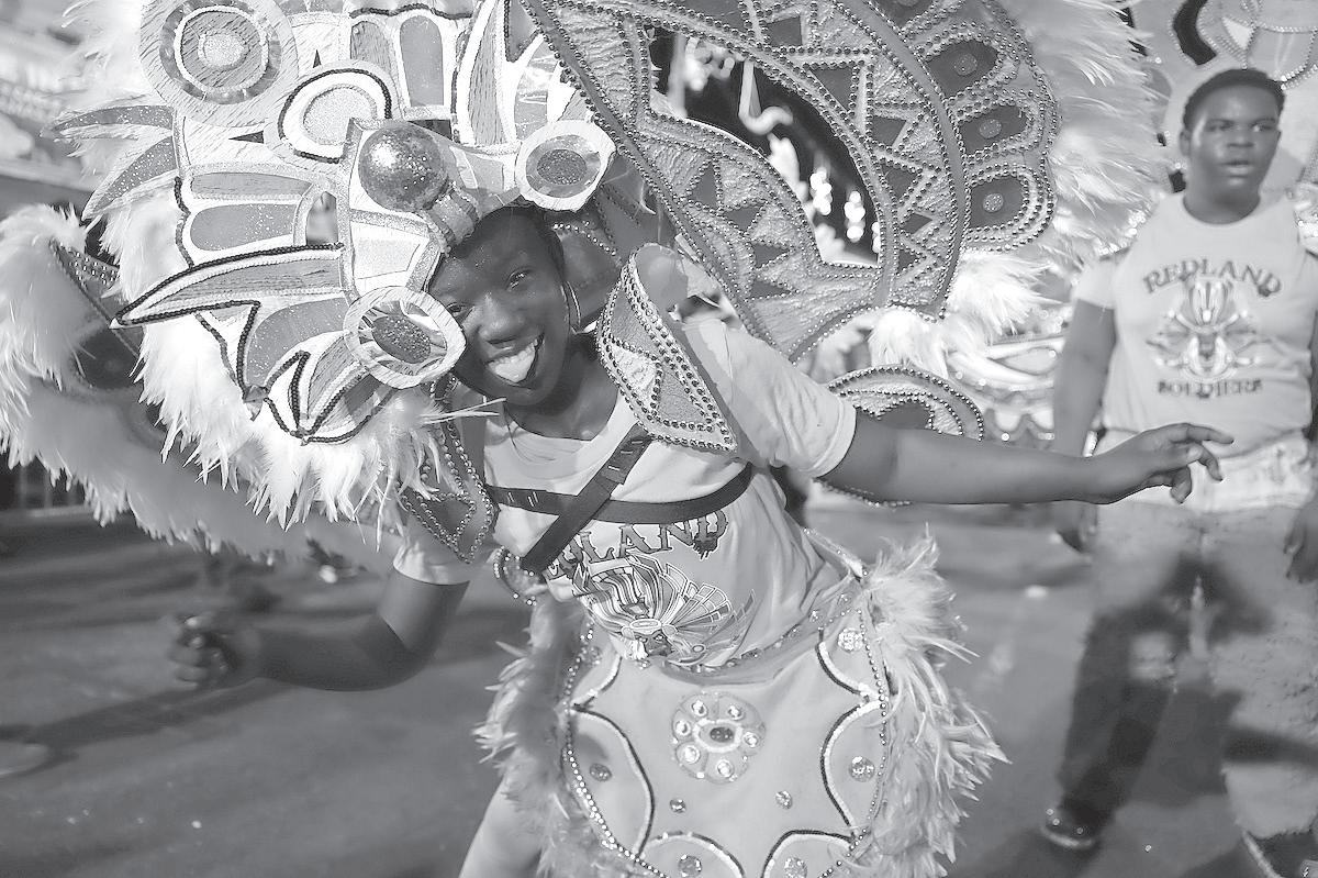 An enthusiAstic member of the Shell Saxon Superstars rushes on Bay Street during the New Year’s Day Junkanoo Parade as the group captured their fourth straight Junkanoo title making history.