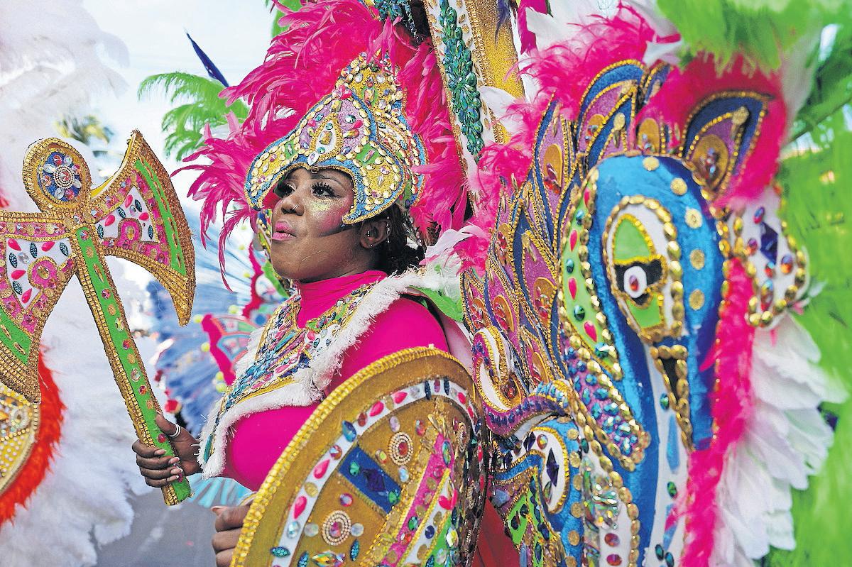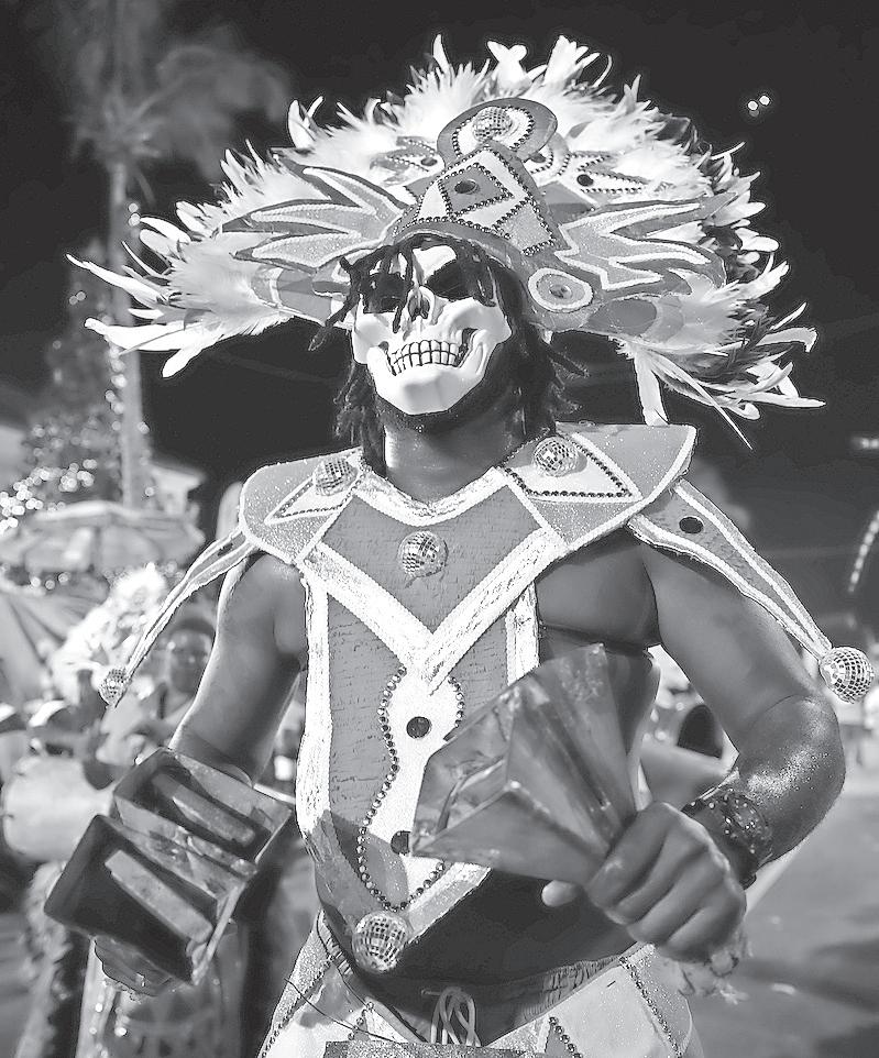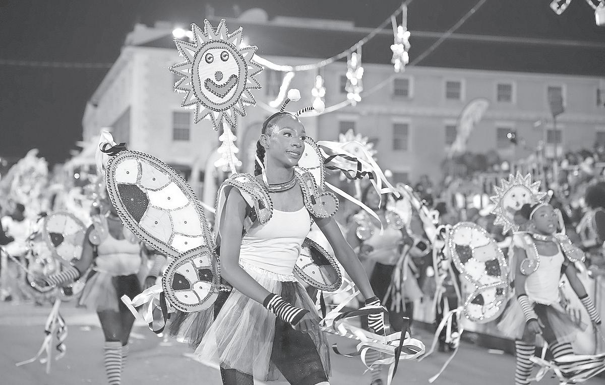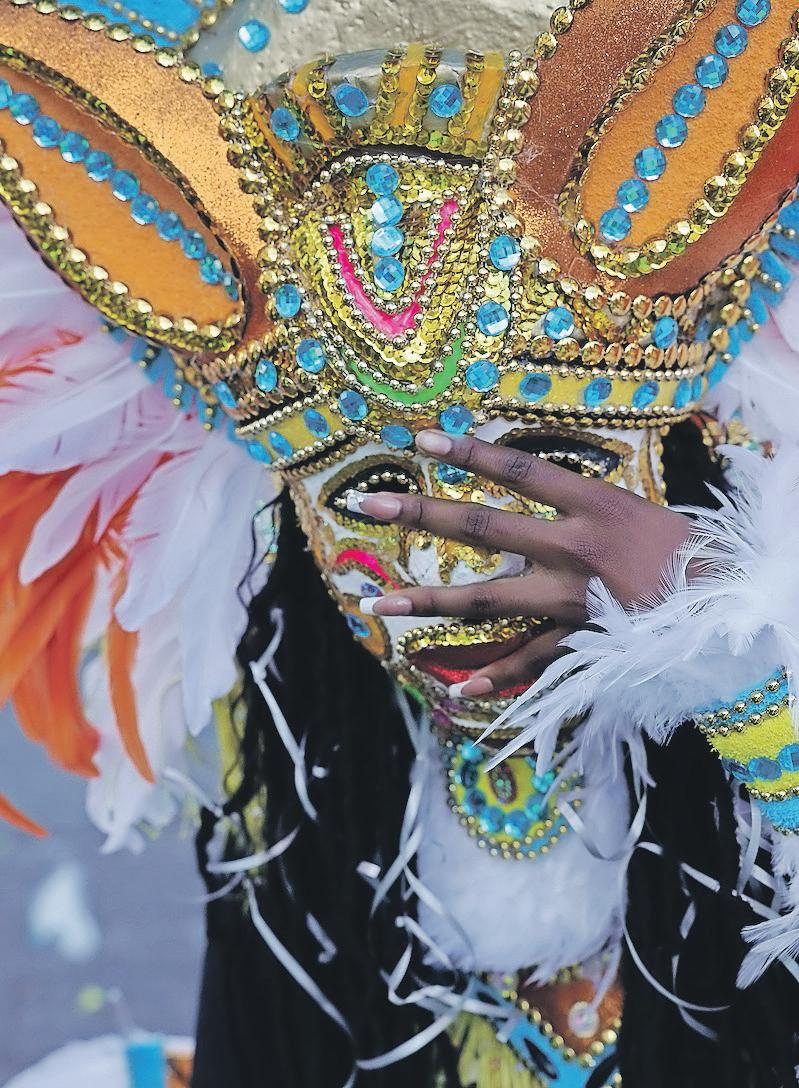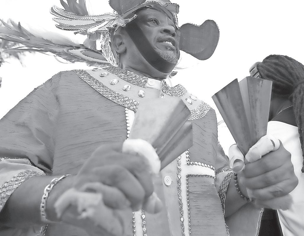An enthusiAstic member of the Shell Saxon Superstars rushes on Bay Street during the New Year’s Day Junkanoo Parade as the group captured their fourth straight Junkanoo title making history.