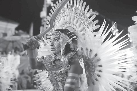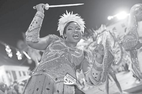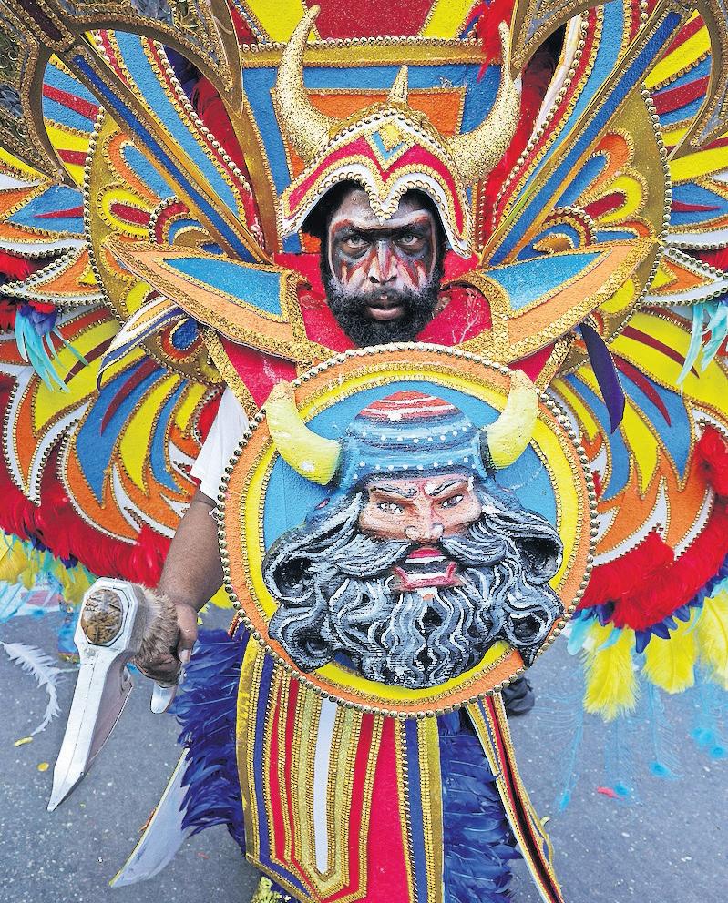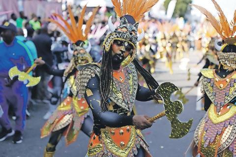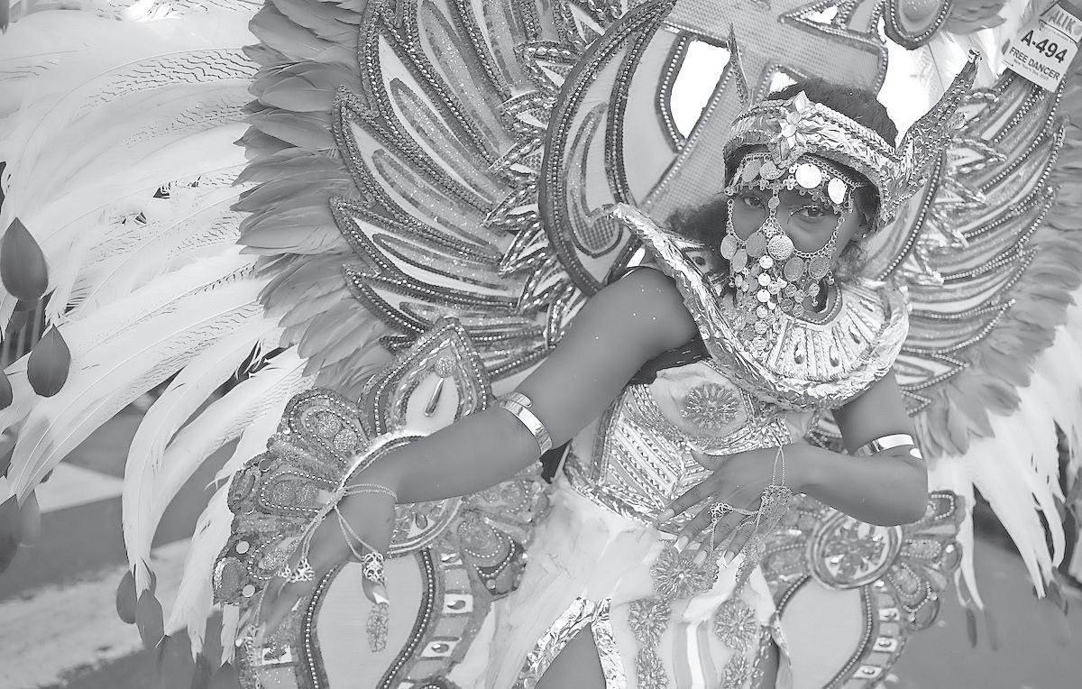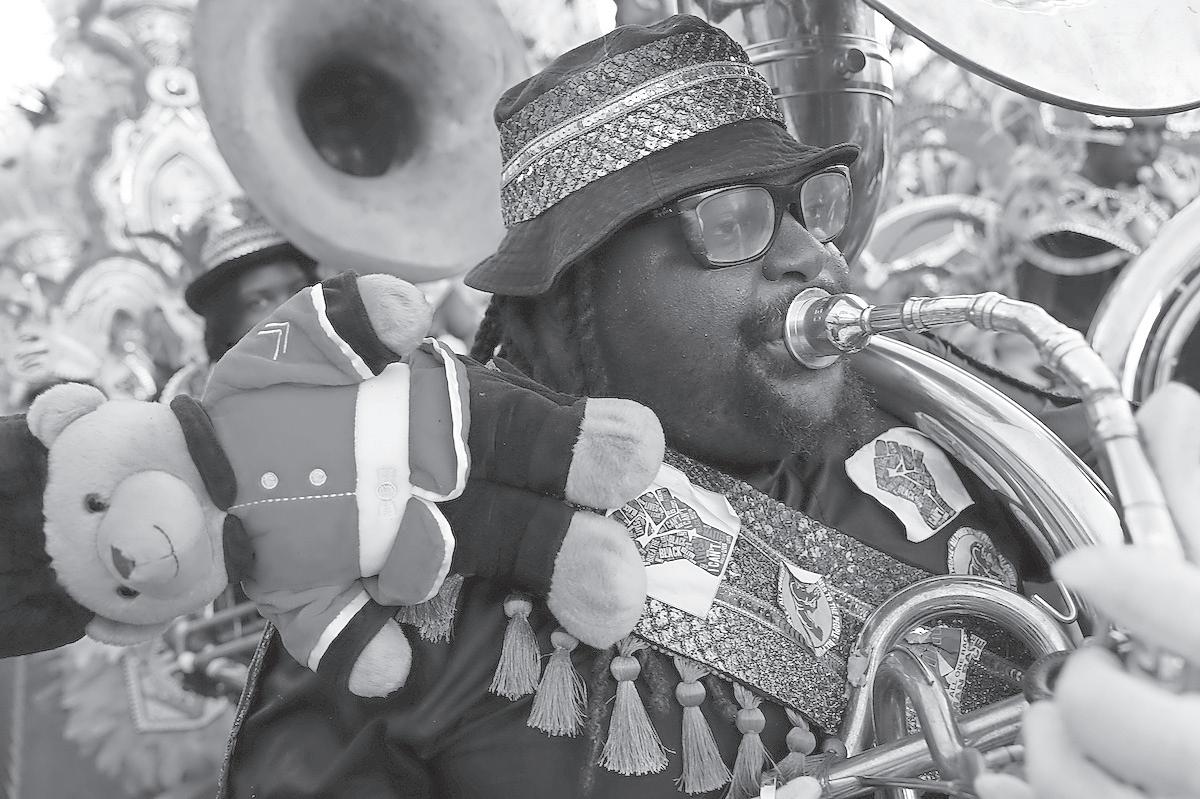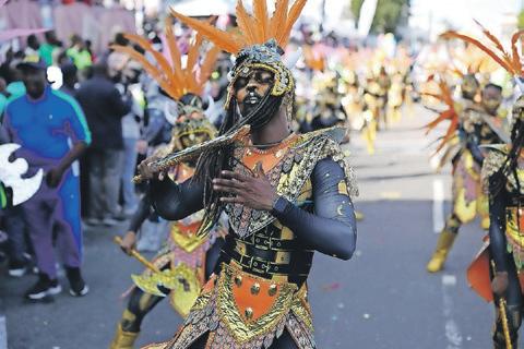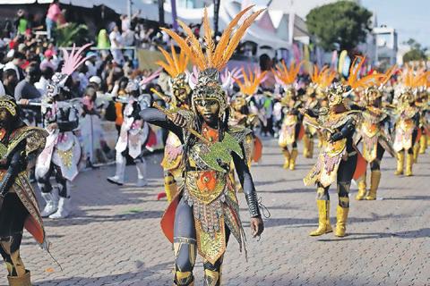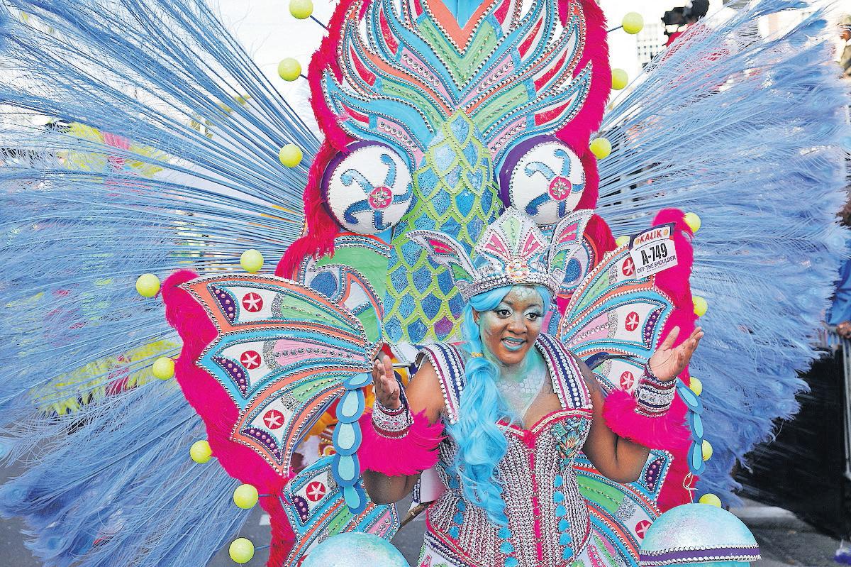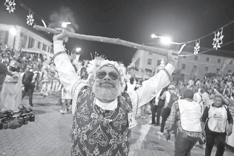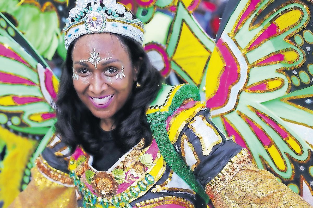 An enthusiAstic member of the Shell Saxon Superstars rushes on Bay Street during the New Year’s Day Junkanoo Parade as the group captured their fourth straight Junkanoo title making history.