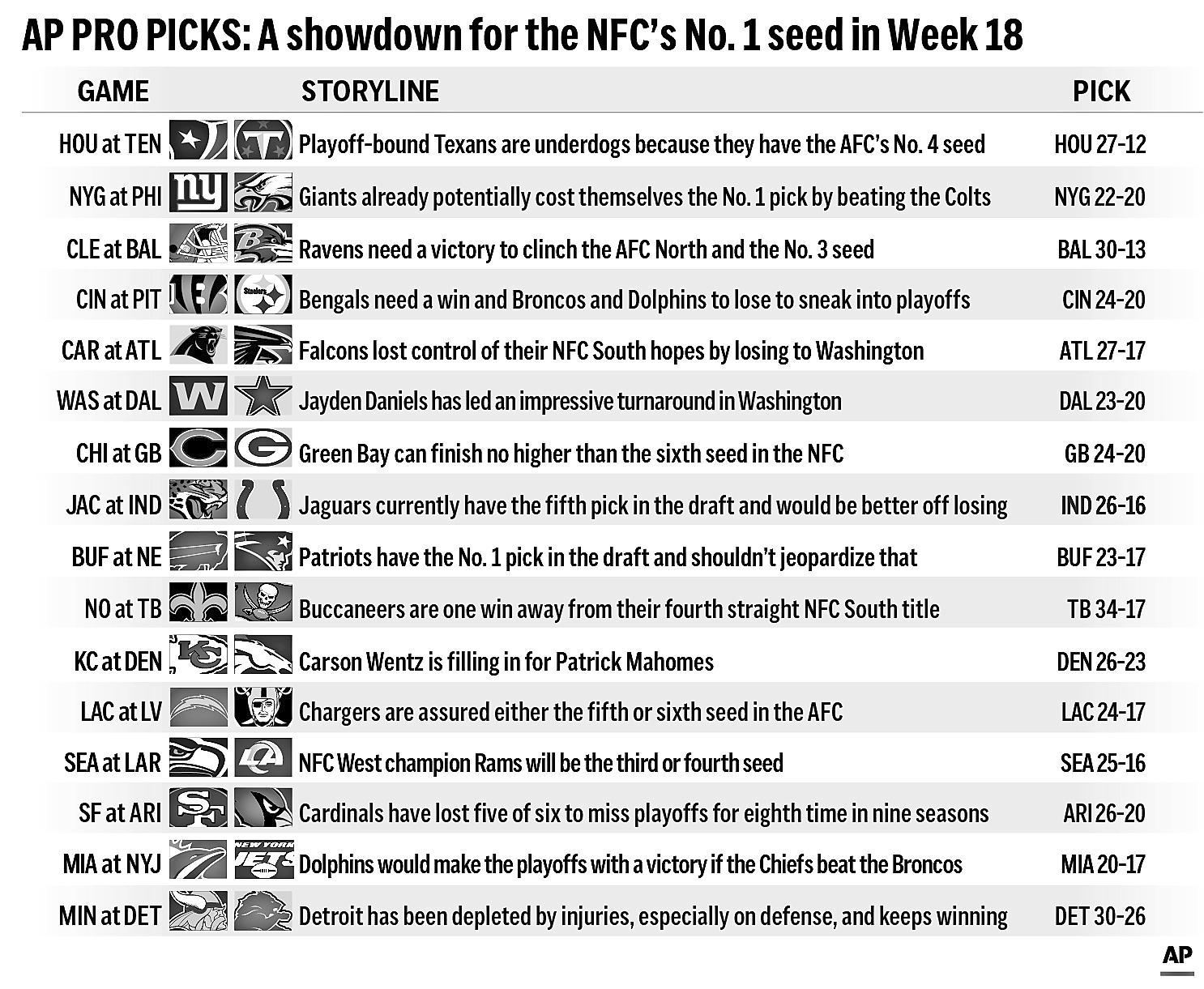 Line: Bills minus 3 Josh Allen’s MVP résumé is complete and the Bills are locked into the No. 2 seed so coach Sean McDermott plans to rest some starters. Allen will start his 115th consecutive game and give way to Mitchell Trubisky. The Patriots have the No. 1 pick in the draft and shouldn’t jeopardise that. Benching Drake Maye is an option for New England, which could benefit from trading that top pick for more draft capital.