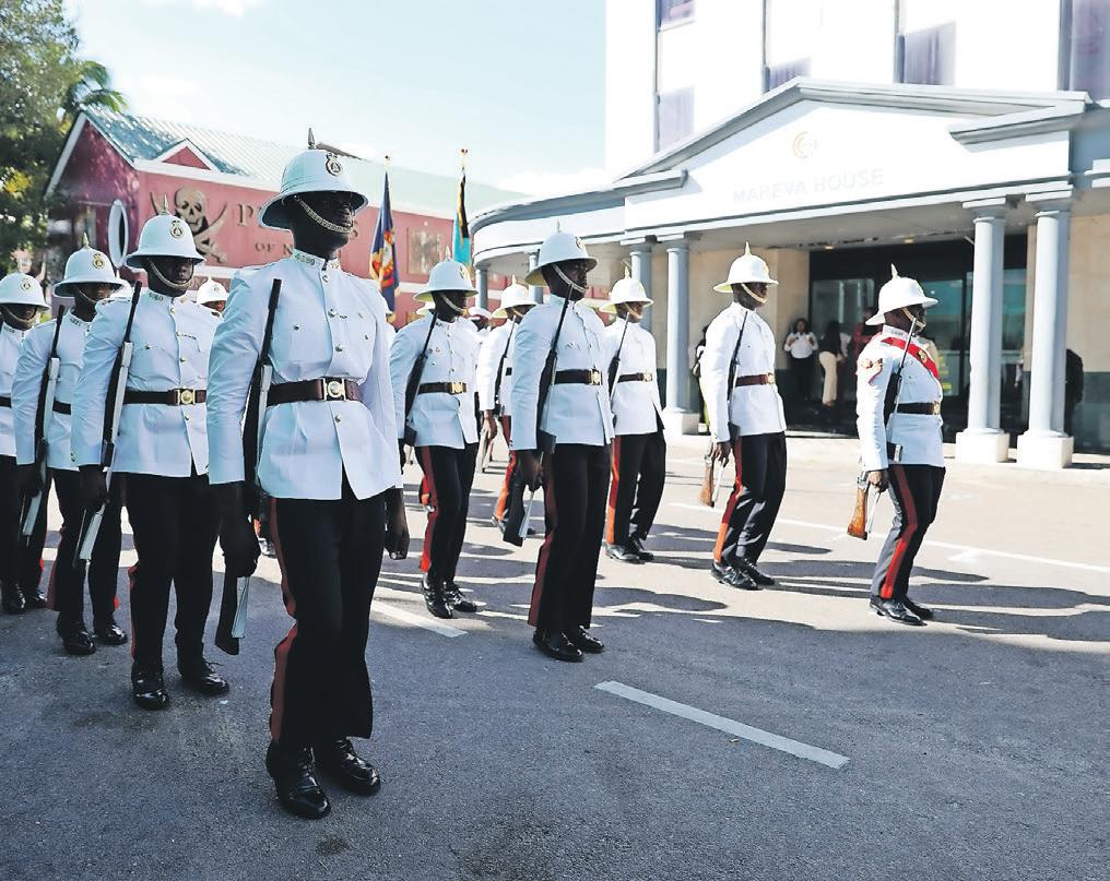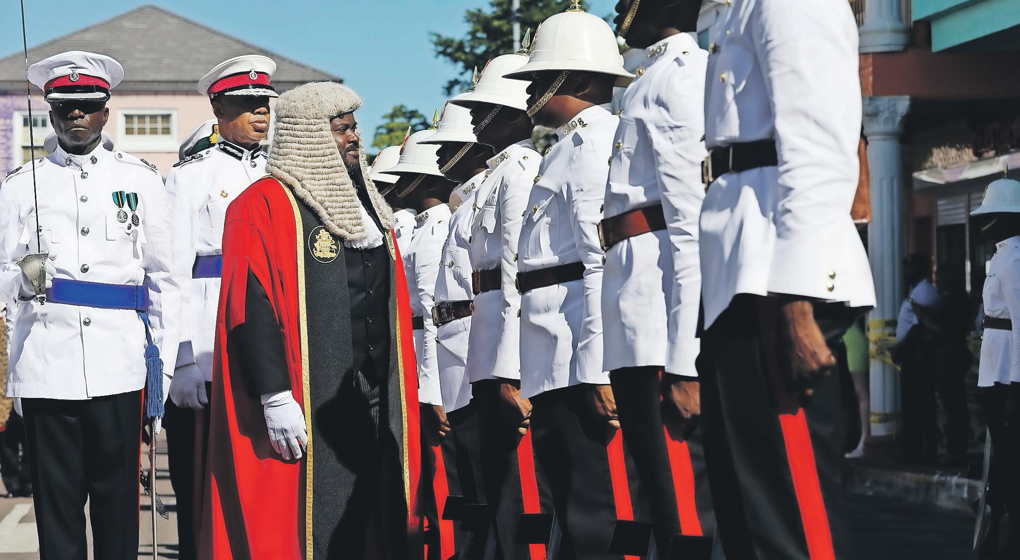 CHIEF Justice Ian Winder inspecting police officers during ceremonies for the start of the legal year.