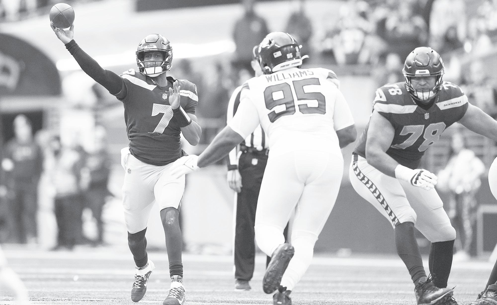 SEATTLE Seahawks quarterback Geno Smith (7) showers against the New York Jets during the first half of an NFL football game, on Sunday, January 1, in Seattle. (AP Photo/Godofredo A Vásquez)