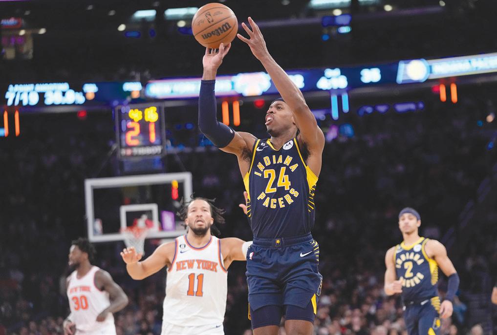 INDIANA Pacers guard Buddy Hield (24) goes to the basket past Knicks guard Jalen Brunson (11) in the first half last night at Madison Square Garden in New York.