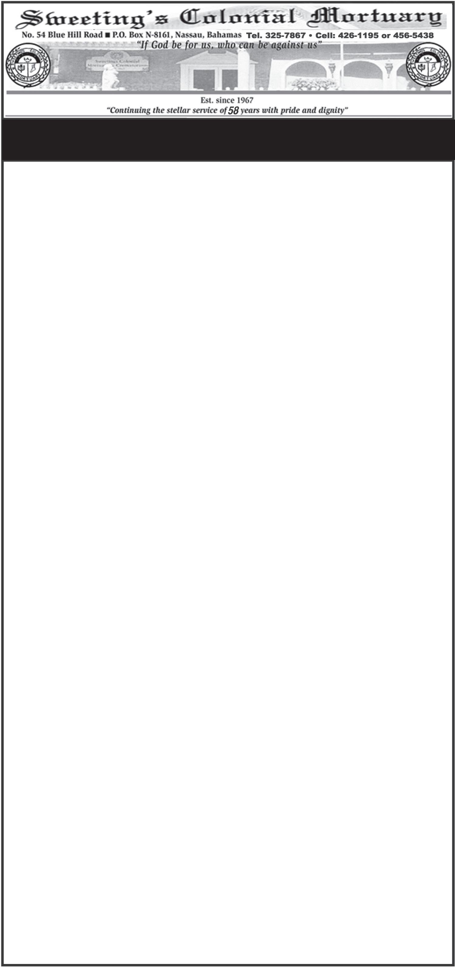 Funeral arrangements are entrusted to Rest On Funeral Chapel Ltd., #166 Kenwood Street, Mount Royal Avenue, New Providence, and will be announced at a later date.