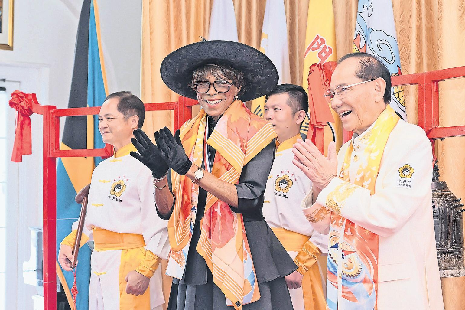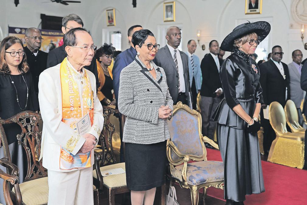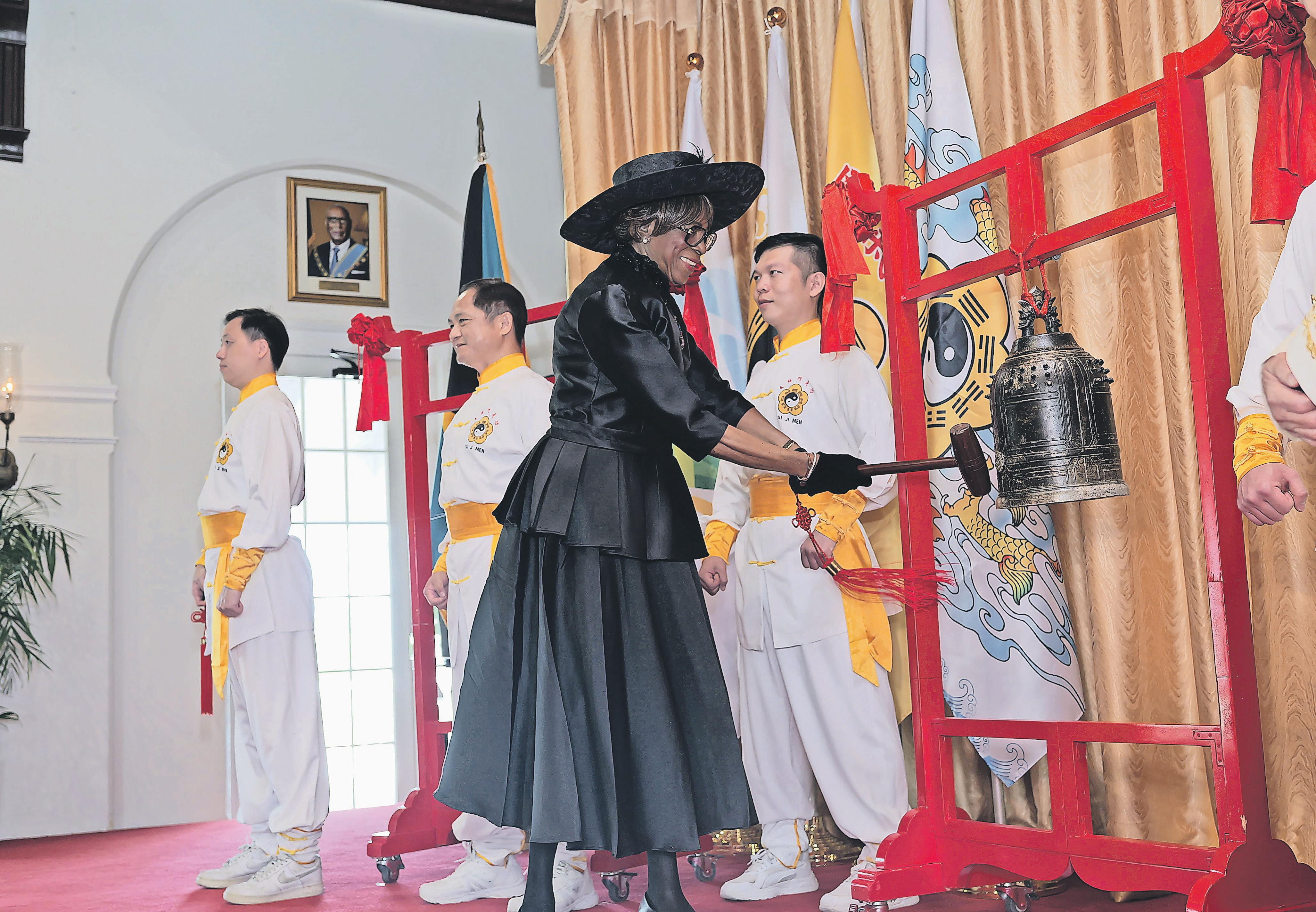 GOVERNOR General Cynthia Pratt rings the Bell of World Peace and Love, marking a symbolic moment of commitment during a ceremony at Government House yesterday as part of the 2026 World Leader