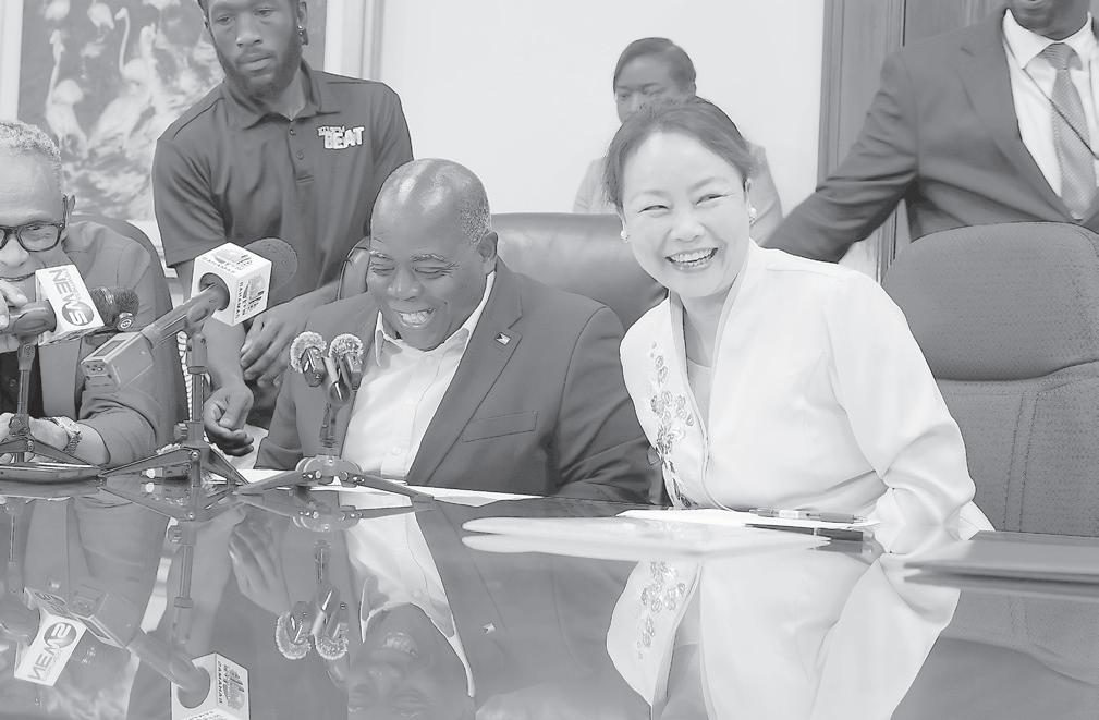 PRIME Minister Philipm ‘Brave’ Davis and Chinese Ambassador Yan Jiarong share a laugh during the handover of $280k in medical equipment. Photos: Nikia Charlton