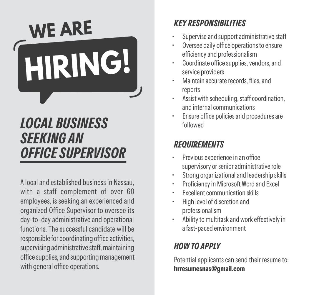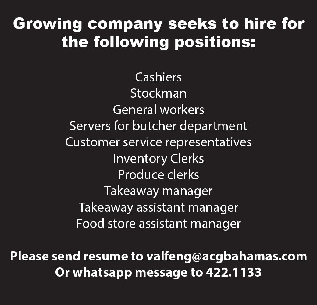 Please send resume, police record and 2 references to: hrdevelopment242@gmail.com.