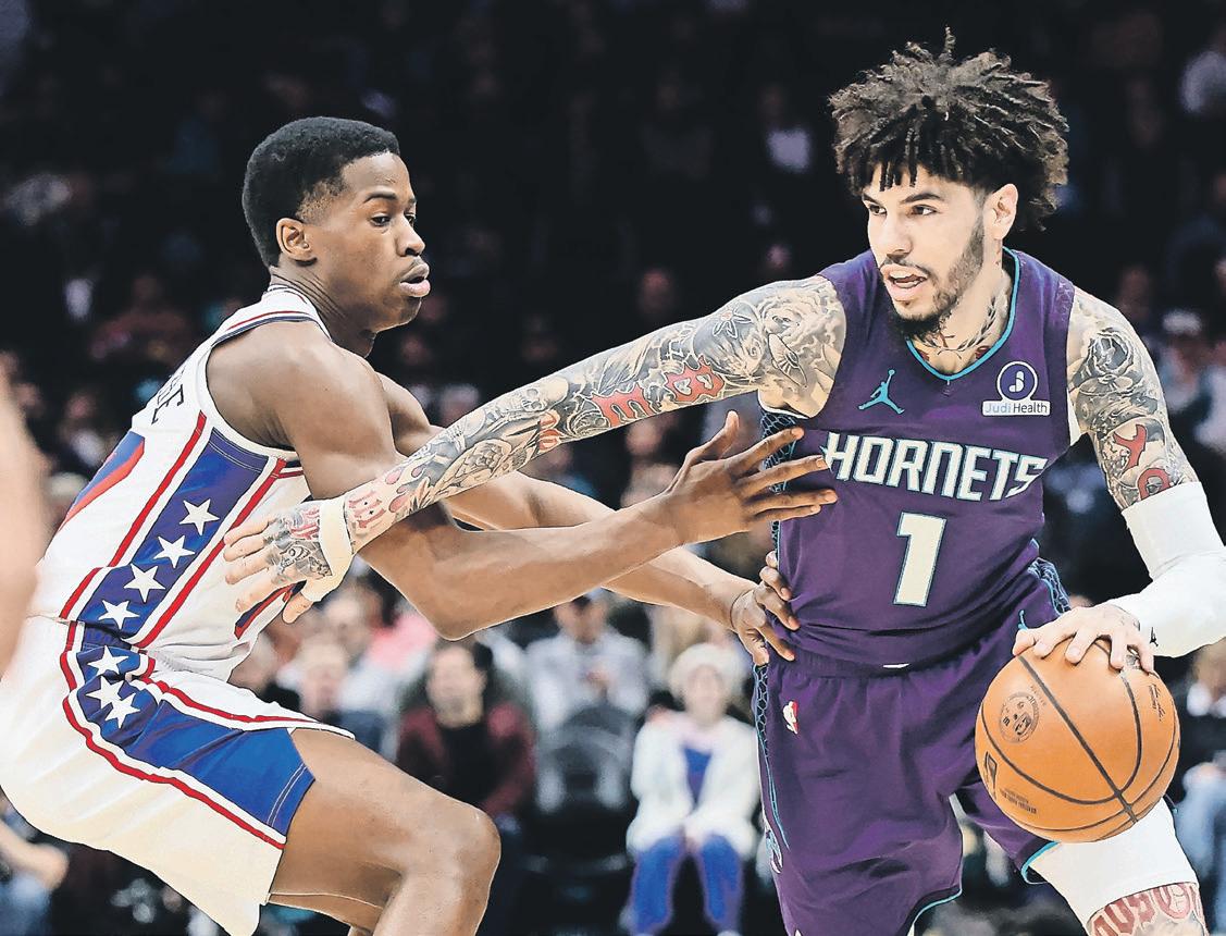 HORNETS guard LaMelo Ball (1) moves the ball against V.J. Edgecombe during the first half yesterday in Charlotte. (AP Photos/Nell Redmond)