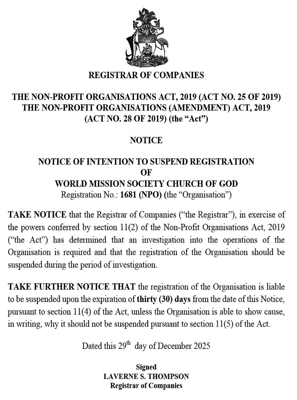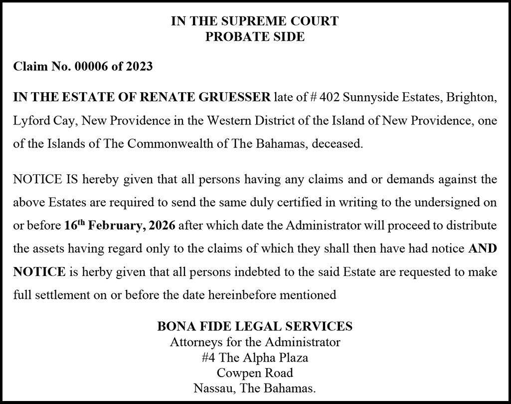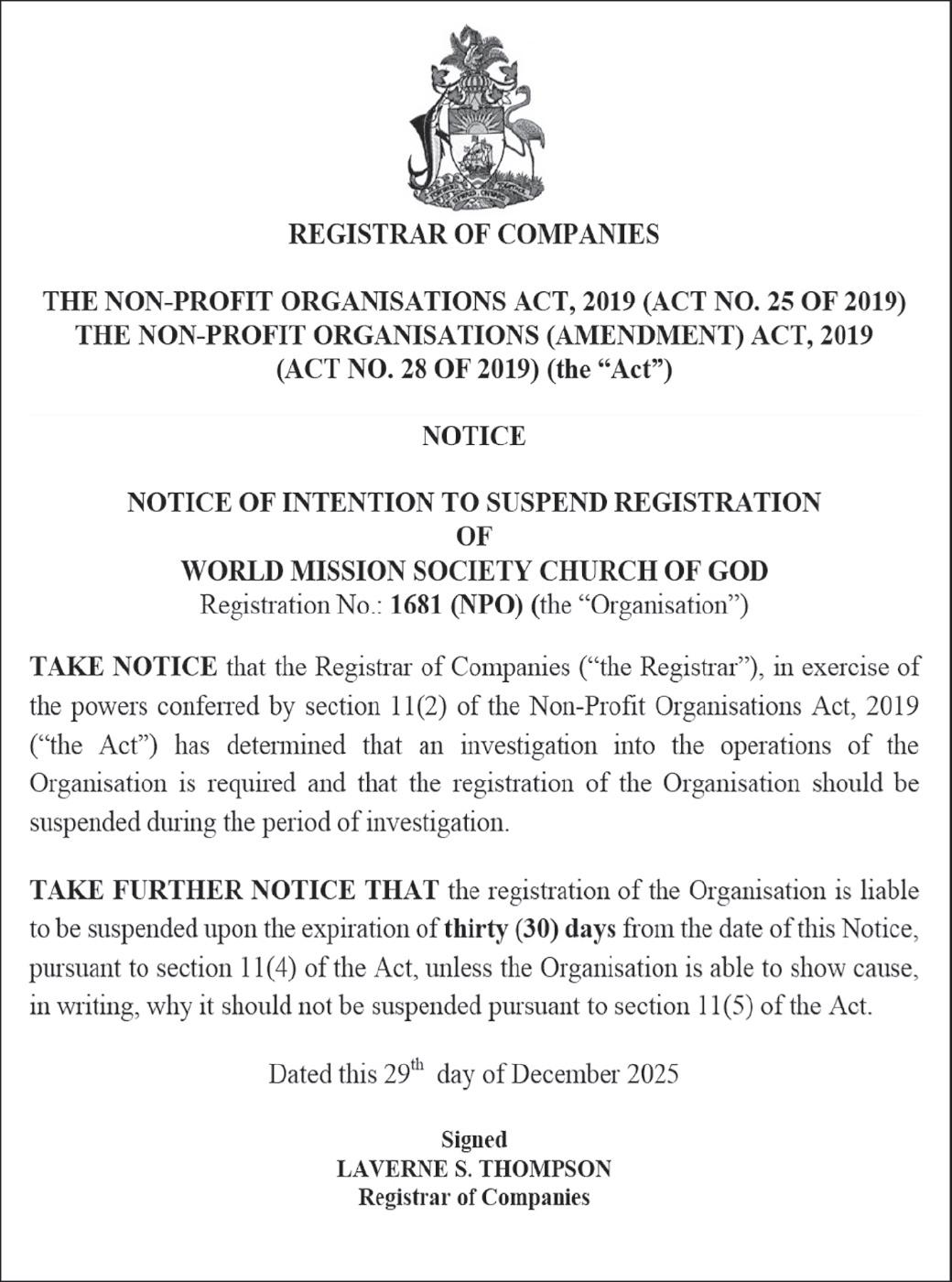 NOTICE is hereby given that ROSALIND CLAIRE THACKRAY of South Ocean, New Providence, The Bahamas, is applying to the Minister responsible for Nationality and Citizenship, for registration/naturalization as a citizen of The Bahamas, and that any person who knows any reason why registration/naturalization should not be granted, should send a written and signed statement of the facts within twenty-eight days from the 28th day of January, 2026 to the Minister responsible for nationality and Citizenship, P.O. Box N-7147, Nassau, Bahamas.