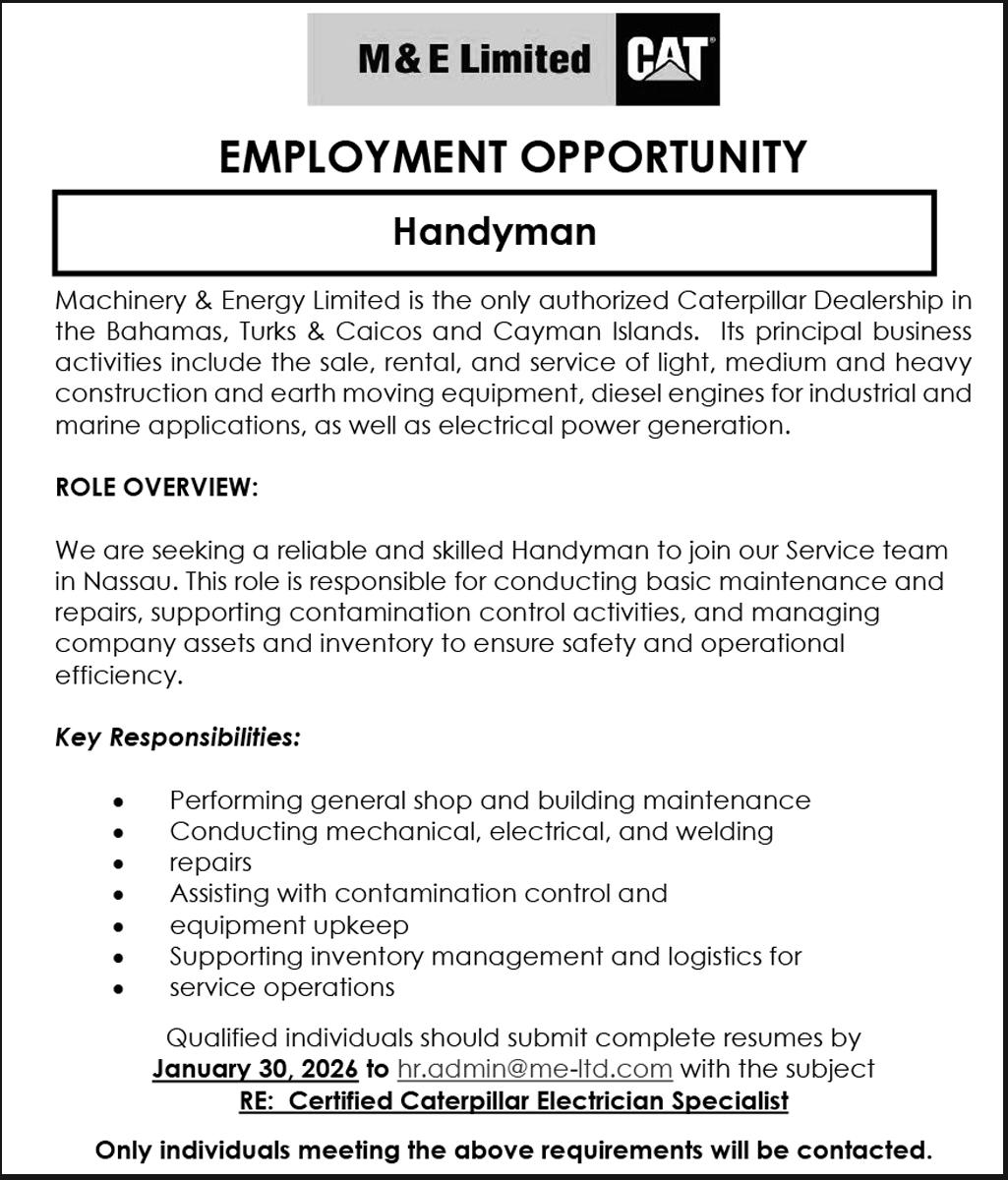 Interested persons can send their resume to jobs@ btcbahamas.com. On-island training will begin in the second week of February. BTC will also seek to onboard on-island services for maintenance, support for power and general services.