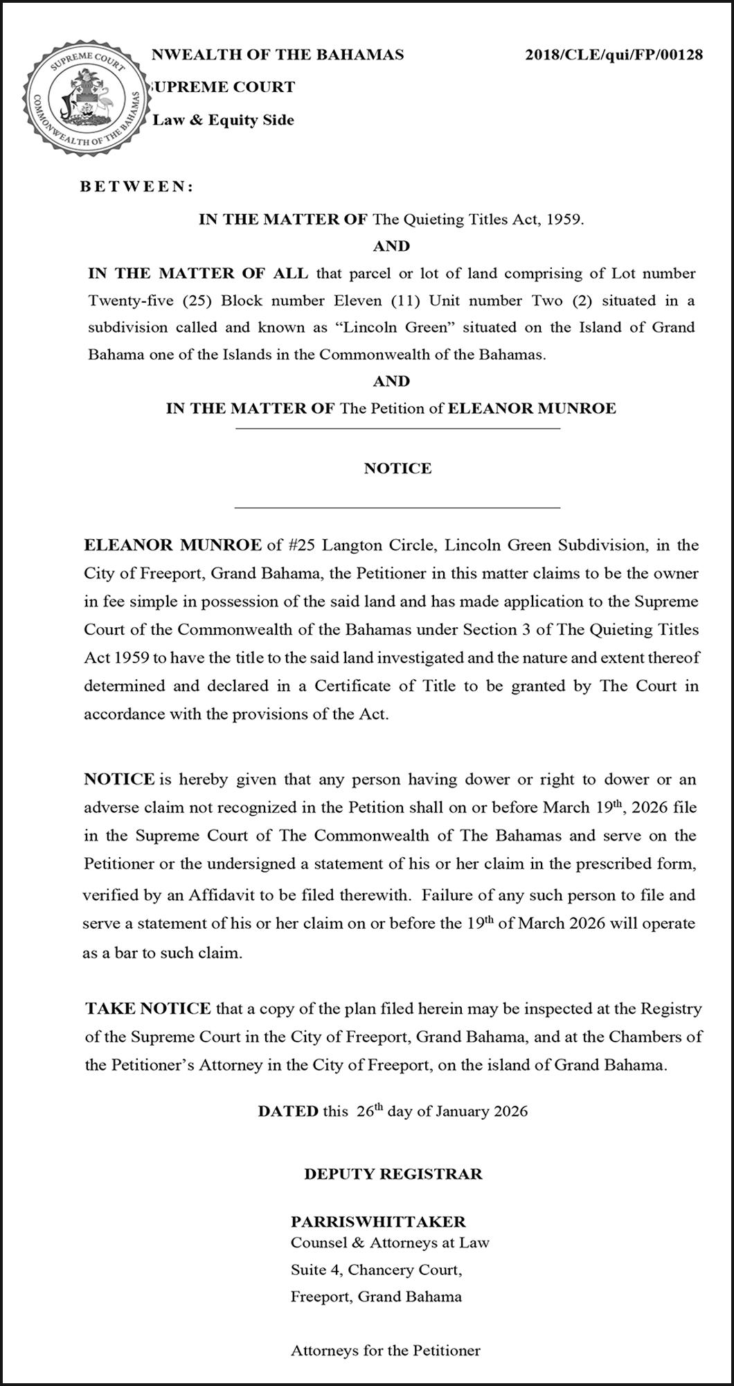 NOTICE is hereby given that LUDOVIC PIERRE of Berry Island, Bahamas is applying to the Minister responsible for Nationality and Citizenship, for registration/ naturalization as a citizen of The Bahamas, and that any person who knows any reason why registration/naturalization should not be granted, should send a written and signed statement of the facts within twenty-eight days from the 28th day of January, 2026 to the Minister responsible for nationality and Citizenship, P.O. Box N-7147, Nassau, Bahamas.