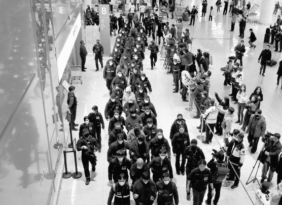 The73South Koreansuspectsallegedlyscammed fellowKoreans outof48.6 billionwon($33 million),according to a South Korean government statement. Uponarrival inSouthKorea'sIncheon airportaboarda chartered plane, the suspects 65 men and eight women were sent to police stations. The suspects, in handcuffs and wearing masks, were escorted bypoliceofficers andboardingbuses.Theywere among about 260 South Koreans detained in a crackdown in Cambodia in recent months.