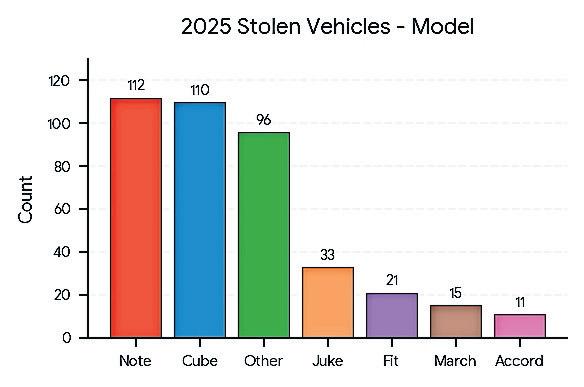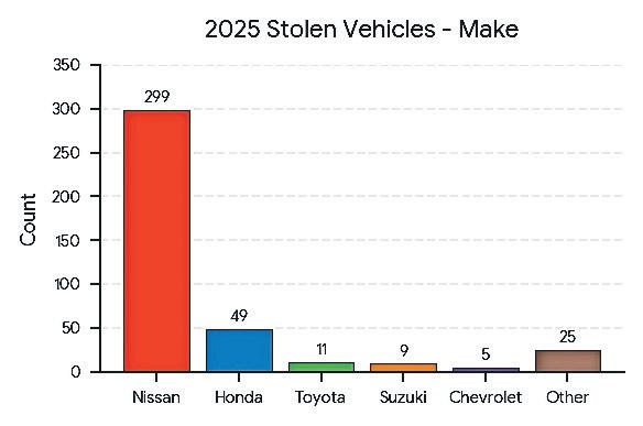 Vehicle theft rose slightly, increasing two percent to 398 cases. Nissan vehicles, particularly Cube and Note models, accounted for three-quarters of thefts, with 59 percent of stolen vehicles recovered. Stealing from vehicles increased seven percent to 200 incidents. Police seized 366 firearms and more than 11,200 rounds of ammunition, resulting in 828 arrests and 292 charges.