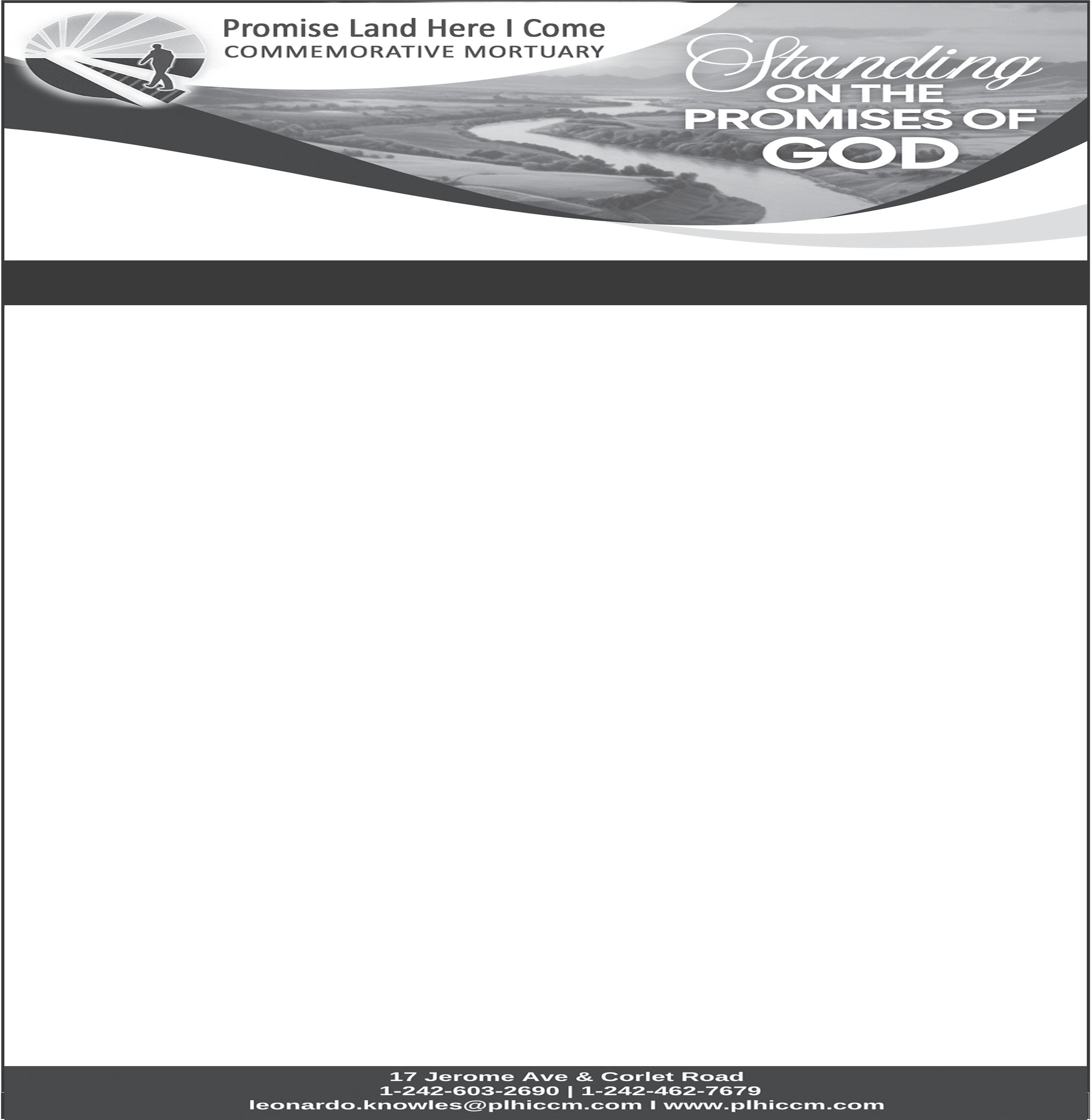 Gilbert, Marilyn Saunders, Mervin and Margaret Reckley and Family, Nelda Sands, Ramonica Hamilton, Pastor Nehemiah and Julie Smith, Charles Williams, Vincent and Ellouise Cooper and Family, Lorna Rolle, Judy Roker, Doug Winters, Alma Sands and family, Bishop Carlton (Genesta) Stuart and family, Maurice (Deborah) Arthur, Kevin (Earlene) Cartwright, Wendell (Viana) Gardiner, Tyrone (Jacquline) Perpall, Deidre Perpall, Kim Douglas, Delma Chisholm, and the Family of the Church of God Cathedral, East Street in Nassau, The Staff of Bahamas Customs Air Freight in Nassau, Members of Green Turtle Community Fellowship Church, Members of Women’s Community Bible Study, Nurse Sandricka Hudson, The Communities of Green Turtle Cay, Dundas Town, Coopers Town and Moore’s Island. Special thanks to the Community of Green Turtle Cay for their prayers, love and support.