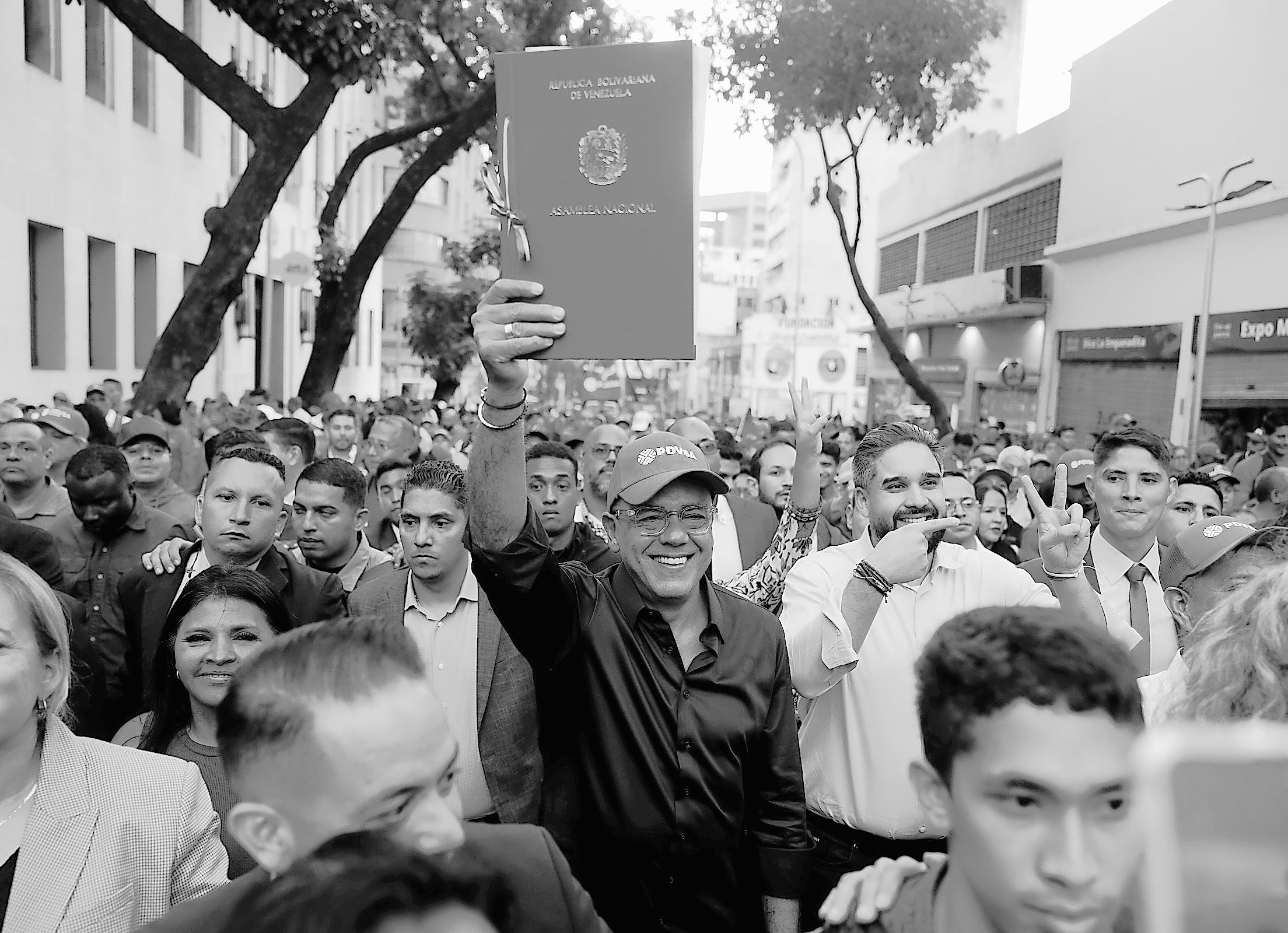 NATIONAL Assembly President Jorge Rodriguez takes part in a rally holding up a copy of a new law after lawmakers approved legislation opening the nation’s oil sector to privatization, in