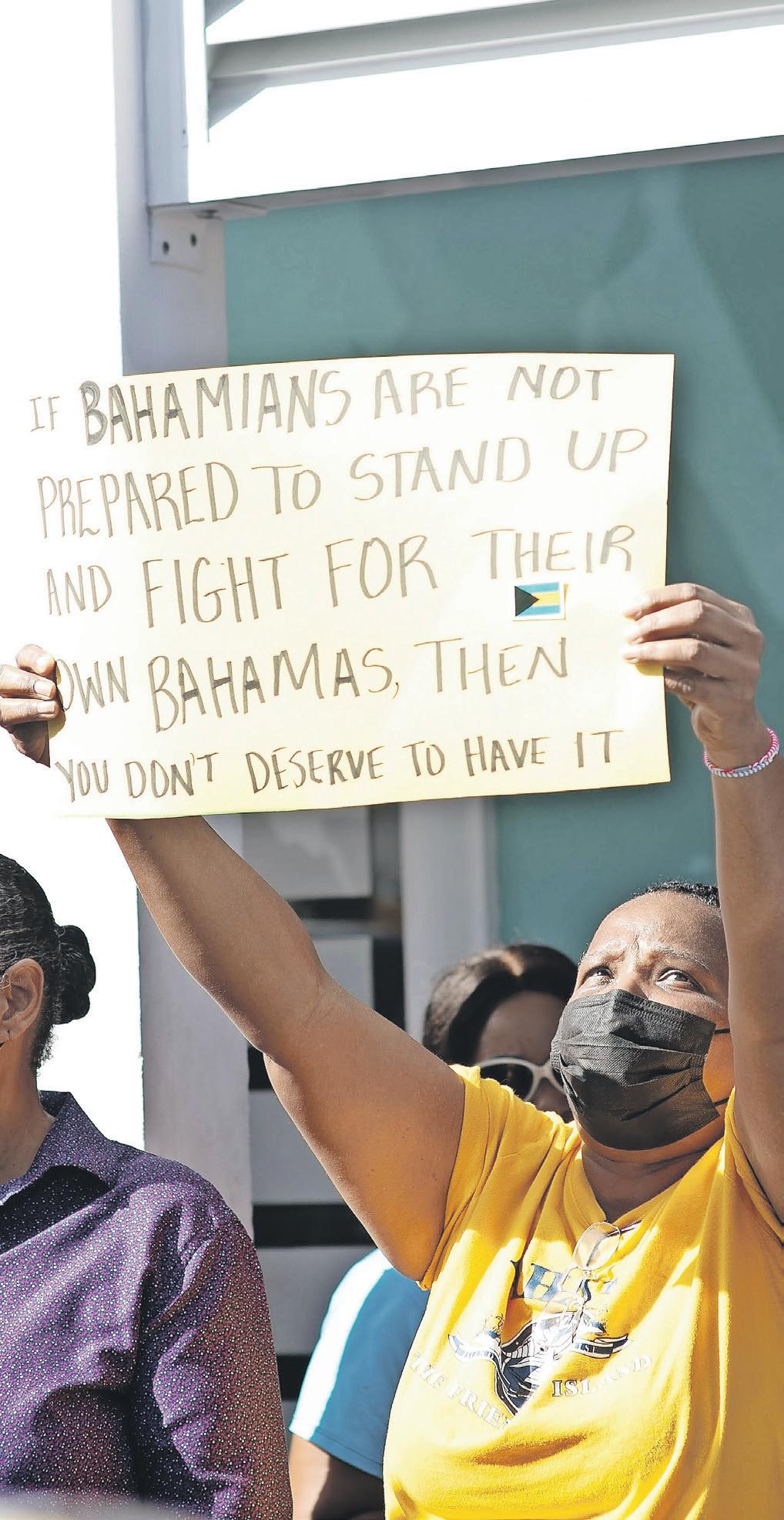 BELOW: A female protestor holds a placard with former Prime Minister Sir Lynden Oscar Pindling’s quote on it; “If Bahamians are not prepared to stand up and fight for their own Bahamas then we don’t deserve to have it.