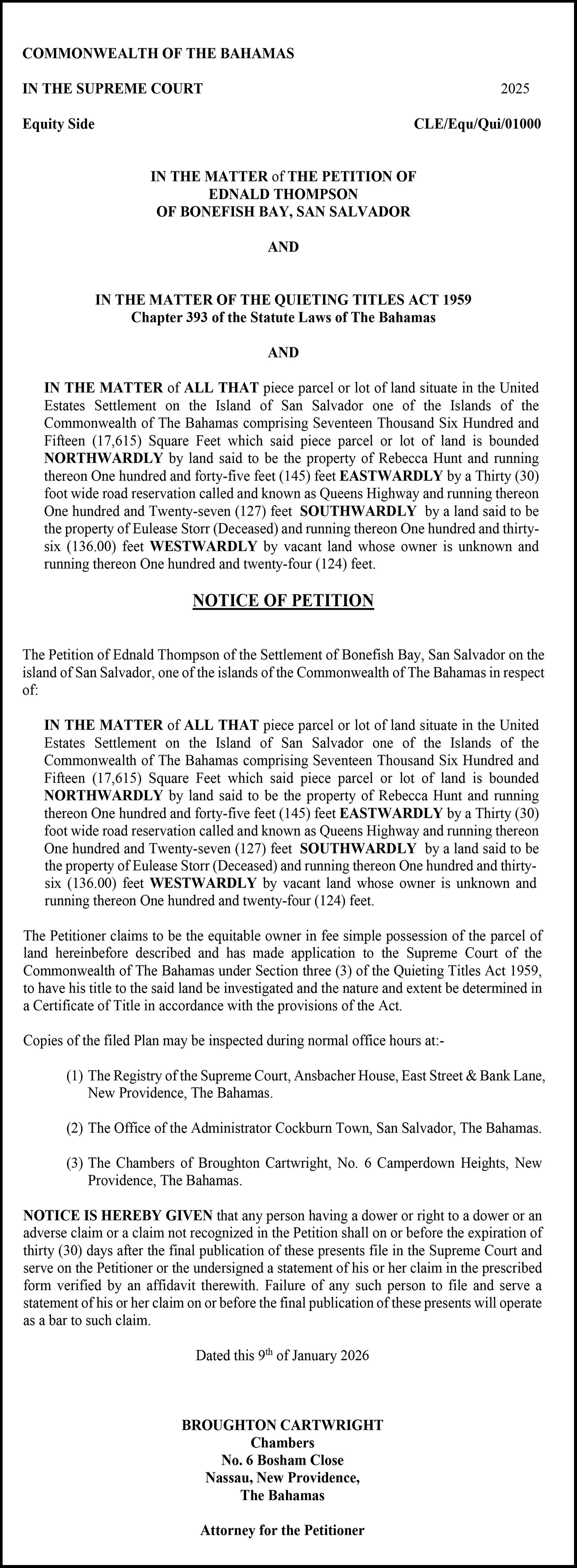 NOTICE is hereby given that BRITNEY DANEIL BENNETT of Bahama Sound #11w, Exuma, Bahamas is applying to the Minister responsible for Nationality and Citizenship, for registration/ naturalization as a citizen of The Bahamas, and that any person who knows any reason why registration/ naturalization should not be granted, should send a written and signed statement of the facts within twenty-eight days from the 2nd day of February, 2026 to the Minister responsible for nationality and Citizenship, P.O. Box N-7147, Nassau, Bahamas.