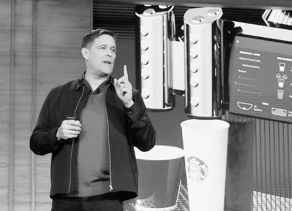 EXECUTIVE Vice President and Chief Operating Officer Mike Grams speaks during the Starbucks Investor Day event, with an
