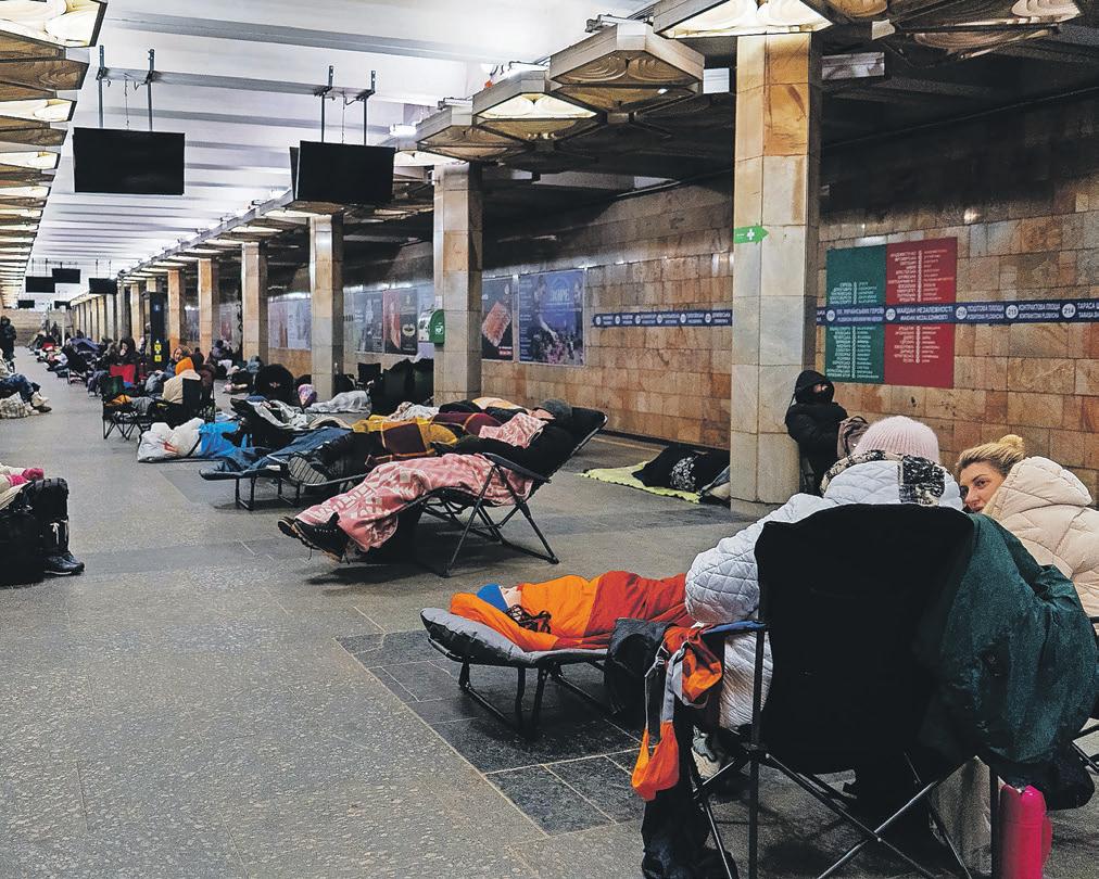 PEOPLE take shelter in a metro station, being used as a bomb shelter, during a Russian drones attack in Kyiv, Ukraine, Tuesday, Feb. 3, 2026.