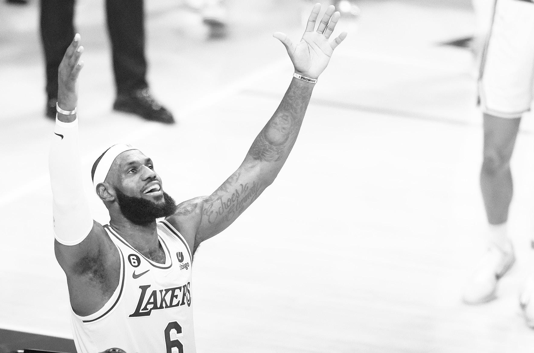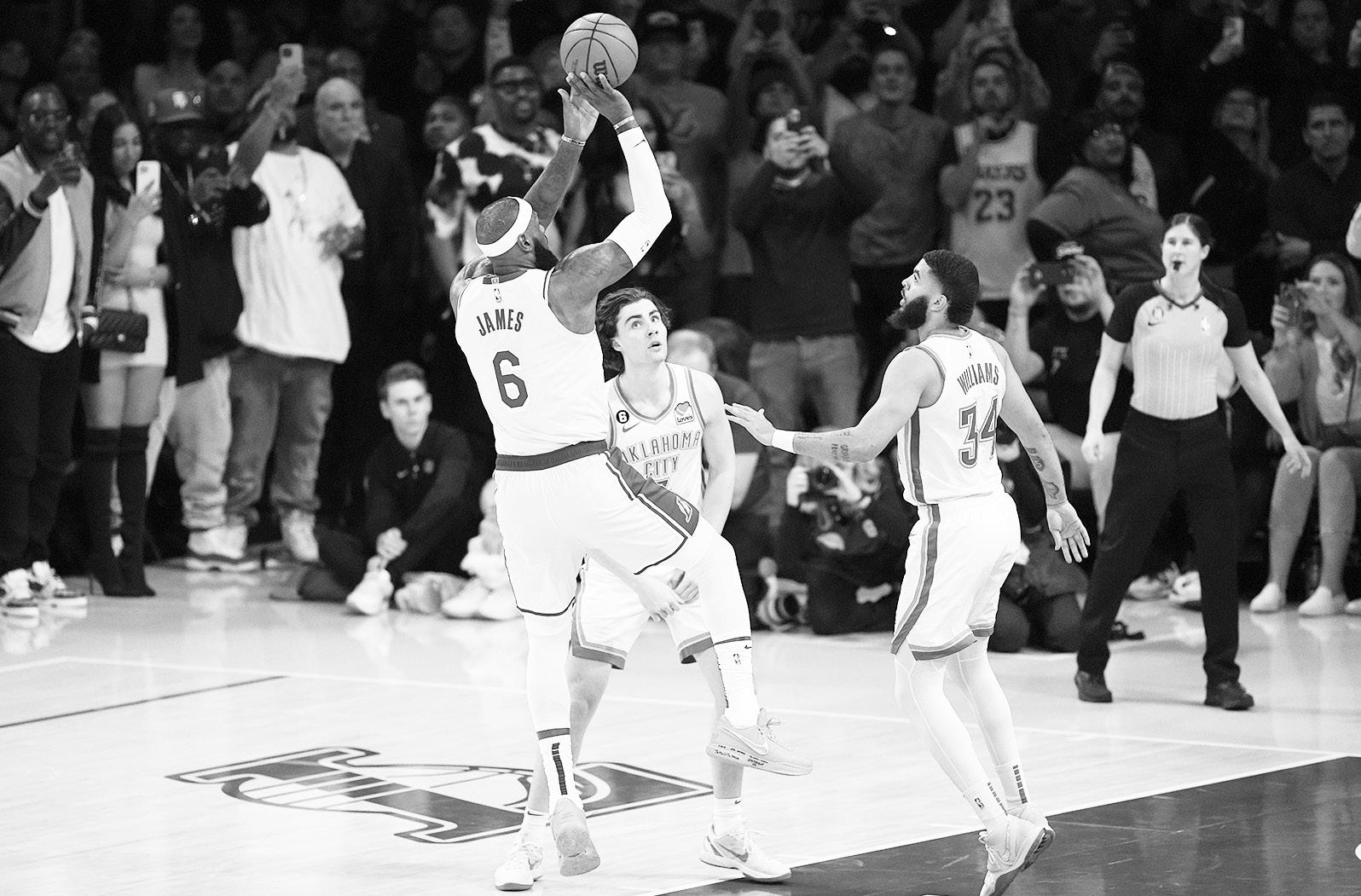 LAKERS forward LeBron James celebrates after scoring to pass Kareem Abdul-Jabbar to become the NBA’s all-time leading scorer against the Oklahoma City Thunder on February 7 in Los Angeles.