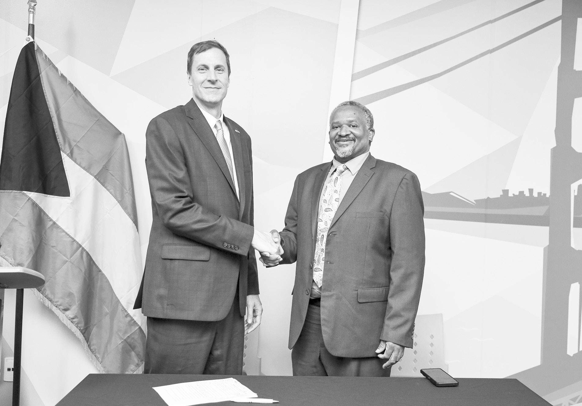MONTEZ WILLIAMS, under secretary in the Ministry of Youth, Sports and Culture, shakes hands with Lance Posey, acting deputy chief of Mission at the US Embassy in Nassau.