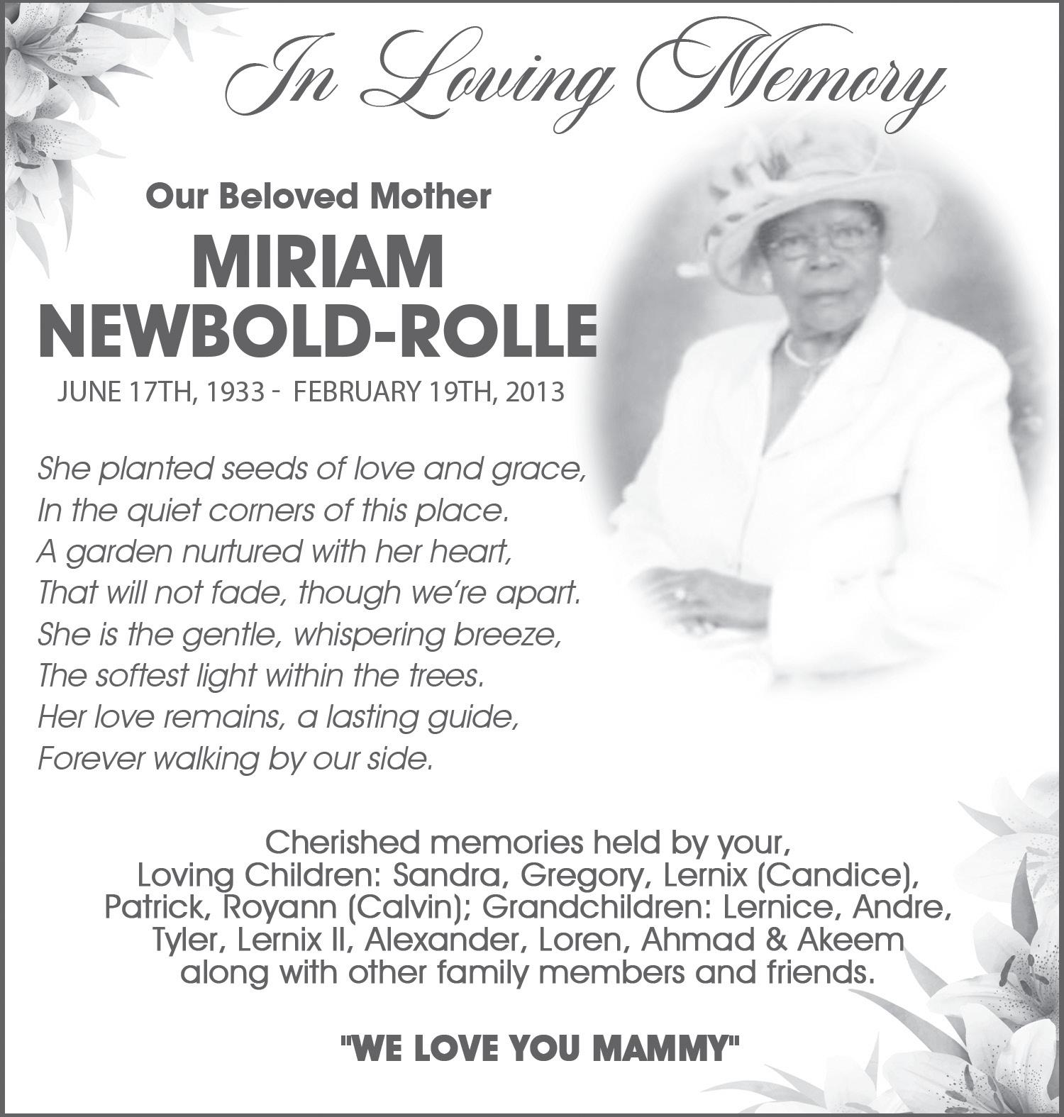 Left to mourn her memory and legacy are her daughter: Leonette J. Roxborough; son: Clinton A. H. Roxborough; granddaughter: Anaya Catherine Marie Gardiner; step children: Edwin Roxbury Taylor (Denece) & Lelia Roxbury; brothers: Leon & Richard Taylor; brothers-in-law: Leonard Roxbury and Rudolph Stuart; sisters-in-law: Ann Taylor, Winifred S. Roxbury, Pauline Taylor, Adline Roxbury, Louise Roxbury; nephews: Solomon Bowleg; Wendell (Jackie) Beneby; Herbert Beneby Jr., Eduardo, Kyle, Josiah Beneby, Patrick (Jennifer) Stuart; Deon (Ivy) Stuart, Ricardo, Jon (Tia), Robert & Roger Taylor; David Spence, Kevin Ryan, Harrington & Barrington Bethel, Andrew Major, Joseph Dean, Raymond Trevor, Stephe, Rodney, Jonathan, Rudolph, Deon, Leonardo, Daniel, Denkita, Bernard, Tyrone and Christopher Dean; nieces: Rosemary (Patrick) Lockhart, Portia Beneby, Allaynia Cash, Clenese (Thaddeus Sr.) Anderson, Shaneka, Angelica & Zinobian Beneby, Angela Taylor, Mary Rolle & Lynda (Levone) Olds; Sherial (John) Pierre, Tabitha (Michael) Culmer, Yvette (Greg) Montot, Sharan Ryan, Monique Taylor, Ayana (Jodie) Brown, Laura (Eric) Gibson, Dawndrea & Jurich Taylor, Michelle Roxbury, Marina Evans, Gloria Taylor, Joycelyn Roxbury, Estella Taylor, Muriel Frazier, Maxine Major, Sandra Fenlon, Nicoya Major, Maxine Roxbury, Bettymae, Rudymae and Gloria Rolle; 22 grandnephews , 18 grandnieces; cousins: Margaret & Greg Dillett, Judith, George, Frederick and Timothy Decosta, Irene DeCosta, Hilda Decosta, Verline Bannister, Elaine, Cleo, Willamae, Quebel and Ruben; Sophie Rolle, Vonnie & Ruth Williams, Norma Goodman; other relatives and friends including: Brenda Ferguson & Family, Rev. Dr. Mavis Thompson & Family, Philip & Judy Davis & Family, William Adderley & Family, Ivan McPhee & Family, Janet