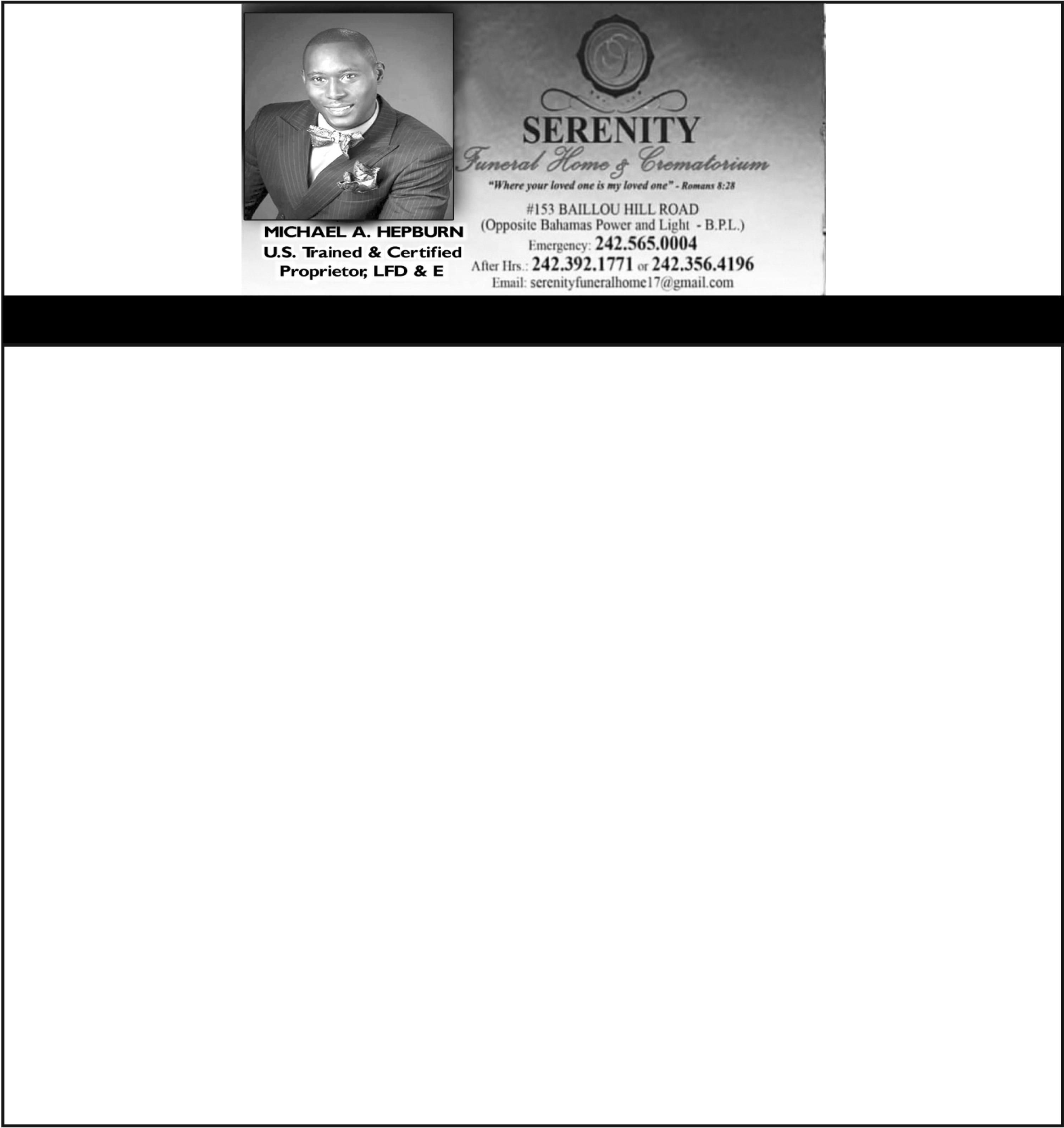 a resident of #4 Rose Close, Malcolm Allotment, New Providence, Bahamas who died at the Princess Margaret Hospital on Tuesday, January 27th, 2026 will be held at 10:00 a.m. on (NEXT) Thursday, February 19th, 2026 at All Saint’s Anglican Church, All Saint’s Way, Joan Heights, Nw Providence. The Rt. Rev. and Rt. Honorable Bishop Laish Z. Boyd assisted by Father Bradley Miller will officiate. Interment will follow in the Lakeview Memorial Gardens John F. Kennedy Drive and Gladstone Road, New Providence. .