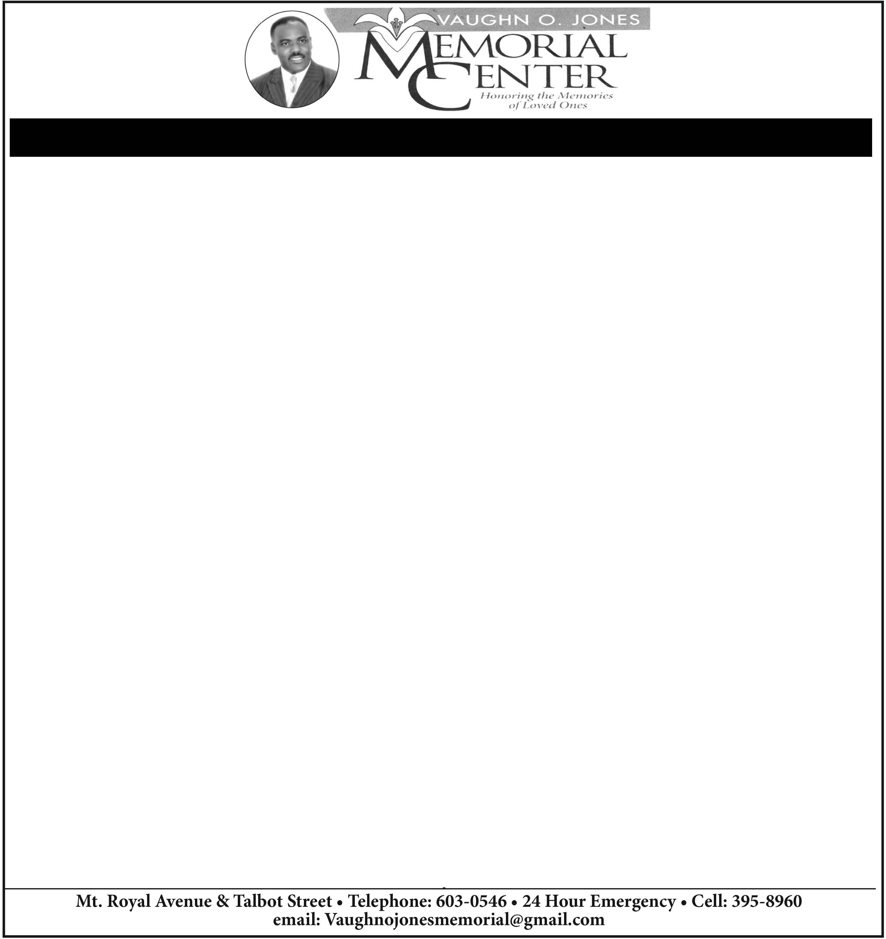 Left to cherish his memory are, Sister: Blossom Rolle. Two Sons: Lorenzo Rolle Sr., Richard Stuart. Four Daughters: Anecka Laing, Erma Stubbs, Margret Knowles, Jacqueline Woodside. Daughter-inLaw: Sophia Rolle. Sons-in-Law: Ted Laing, Duke Stubbs Sr., Henry Knowles, Shamari Woodside. Nieces: Agatha Smith, Dr. Wendy Fernander, Carnie Gibson, Anges Johnson, Bloneva Throtman, Aleretha Bethel, Helena Smith, Gretta Brown, Valderene Williams, Valderine Bain. Nephews: Haverson McKenzie, Norward and Victor Rolle, Angus Farrington, Donnie and Kenneth Saunders, Raymond and Anthony Lewis, Anthony and Tyrone McKenzie. Grandchildren: Antoinette Gilbert, Shakera (Keenan) Johnson, Michel, Shanda, Keith (Adrianne), Lorenzo Jr., Dwayne, and Ezra (Maryanne) Rolle Jr., Lorissa Dames, Megan, Tisha, Tameka, Teddy, and Lavonne Laing, Amy and Marcus Knowles, Duke Stubbs Jr., Anishka (Duke) Davis, Maria (Clee) McQuay, Otiesha Coakley, Paulette Strachan, Dennishqua McPhee, Franklyn Woodside, Paulette Strachan, Latoya (Arisnod) Zephy, Lydia (Bryan) Williams, Dominique Neely. Great Grandchildren: Brianna, Enoch, Riley, Keshawn, Sean, and Tasean Rolle, Marissa, Melissa, Daniel, Brynae Williams, Clee McQuay Jr., Antonio and Janterrius Saunders, Kenria Forbes, Tianna and Trayvon Laing, Nestaesa Cartwright, Shemar Hendfield, Ayana Johnson, Kearra Newton, Lavae Thomspon, Shylah Thurston, Desean Lockhart, Shane Stubbs Jr., Arihanna, Ashe, Jaden, Brianna Smith, Renaldo McCartney Jr. Grand Niece and Nephew: Scenario (Nicolette) Farrington, Reokeisha Farrington, Shaniqua (Rico) Cargill, Meagan & Shanilee Bullard, Gary (Tannie) Tinker, Lashan (Khristopher) Gray, Ikemonique (Wayne) Forbes, Barry (Treniere) McKenzie, Ikevaughn McKenzie, Anayah