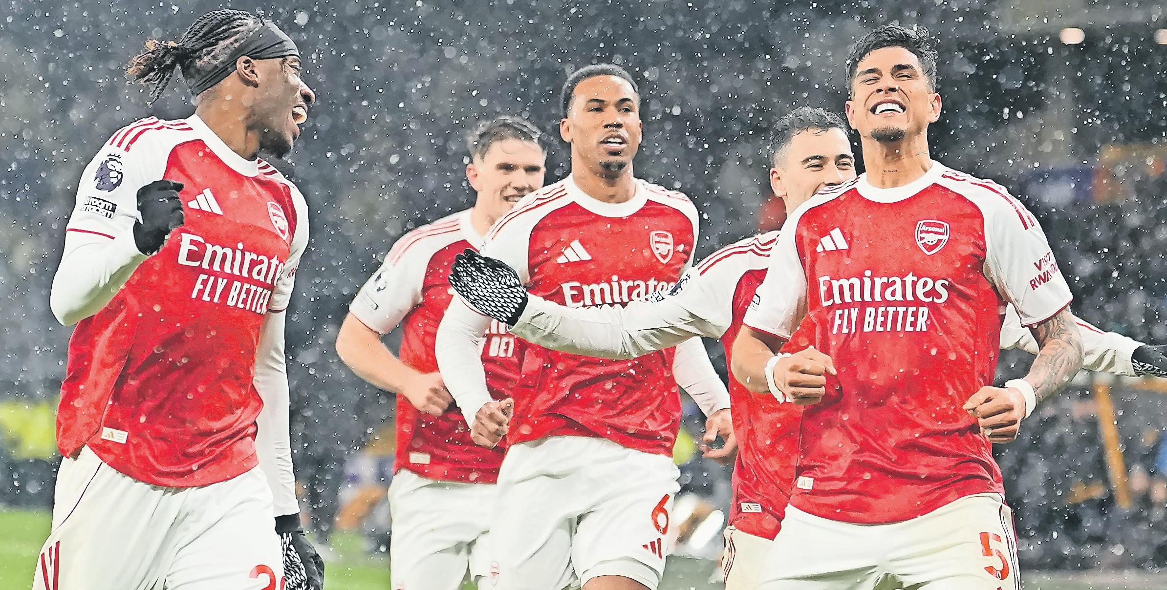 ARSENAL’s Piero Hincapie, rights, celebrates with teammates after scoring his side the second goal during the Premier League soccer match between Wolverhampton Wanderers and Arsenal in Wolverhampton, England, yesterday.