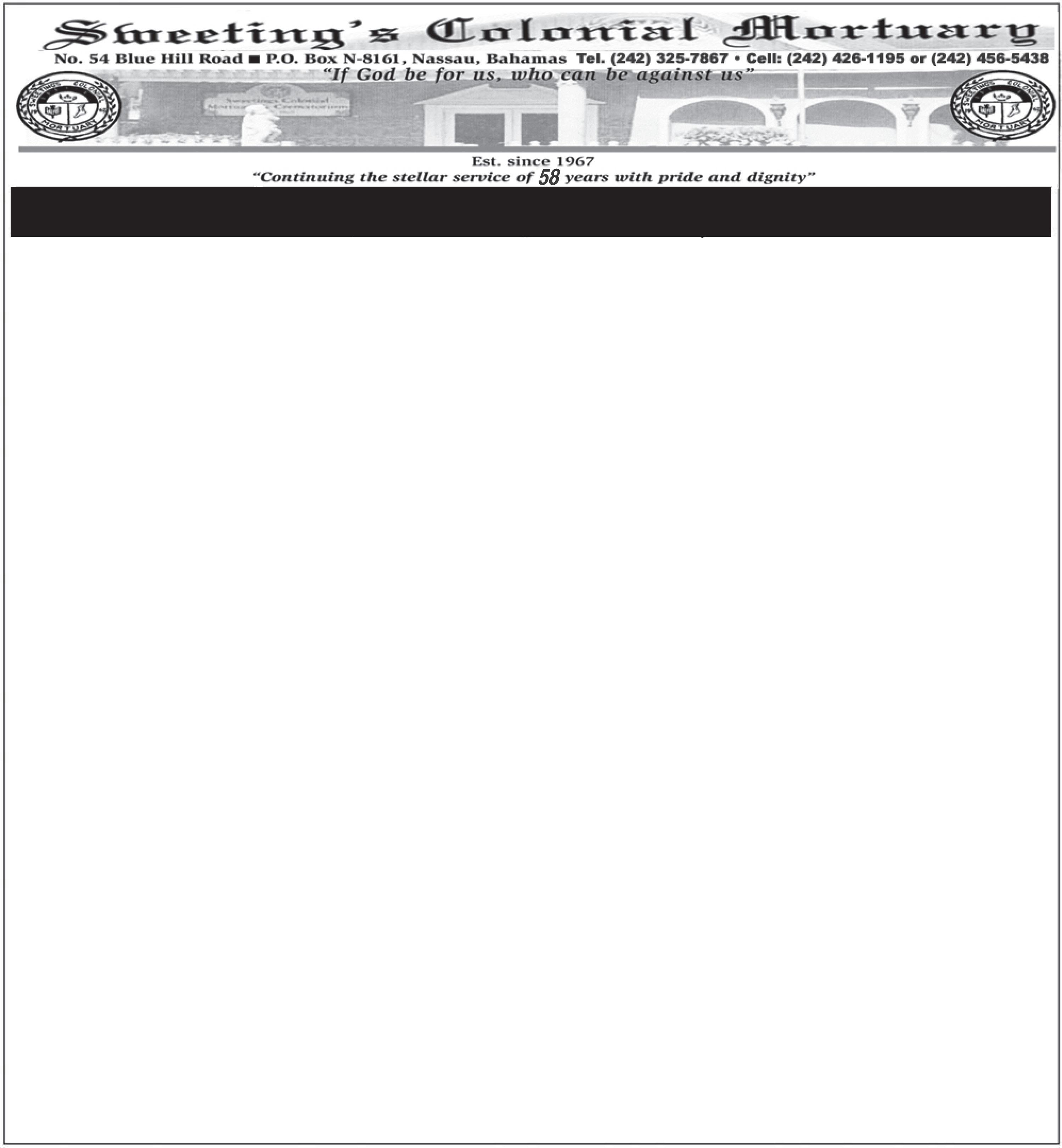 The body will repose at The Chapel of The Saints, Sweeting’s Colonial Mortuary on Friday from 10:00am to 5:00pm and on Saturday from 10:00am until service time at the church.