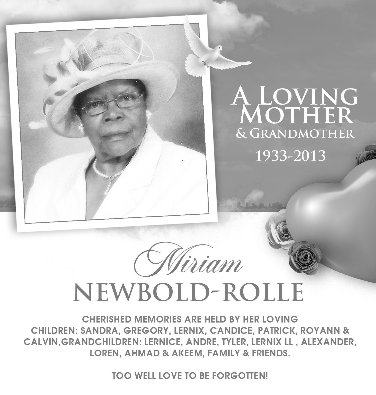 Left to cherish her memories are her children: Shirley Strachan, Elcina Smith, Charles Knowles & Rocelia Wright; sons-in-law: Vincent Strachan Sr & Frederick Smith; daughters-in-law: Florene (Ron) Conner & Patrice Knowles; grandchildren: Shekera (Robespierre) Dorisme of Kissimmee FL., Vincent Jr. & Vincette Strachan, Latanya & Frederick Smith Jr., Tomara Knowles, Tameka, Charlice, Patrice & Charles Knowles Jr., Shaniqua (Damian) Tinker, Glen Jr., Valentina, Ashley & Gleniqua Wright; great grandchildren: Tanaj Munnings of Kissimmee FL., Frederick III, Vanique, Alexander & Ayden Smith, Bryan Lamar, Tyrico Moise, Cashon, Kaché & Kamari Storr, Neveah Tinker, Wendell Bethel and Shaquell Wright; brothers-in-law: Emery Symonette Sr., Everette & Neville Knowles; sisters-in-law: Gloretta Cherenfant of Georgia, Gertrude, Joanne & Estella Knowles; aunts: Catherine Minnis; Nieces: Emeline (Bertrum), Joan Mackey, Evannette, Bernadette (Micheal), Ingrid (Sidney), Remelda (Andrew), Bianca (Brandon), Anna Louise, Veldia, Vanessa, Joan Knowles, Lauren, Sandra, Oralee, Norma, Ginger, Gaynell, Esther, Gabrielle, Colleen, Lendeth Knowles, Harlene, Rochelle, Anita, Allison, Samantha, Ageria, Barbara, Antonia, Melissa, Thelca, Denise, Shaelene, Korrina and Myrah; nephews: Rupert (Stephanie), Tyrone, Emery Jr. (Sharon), Anthon, Edmund, Edward, Larry, Kevin, Jason, Hugh, Craig, Nero, Keith, Micheal, Gerard, Cyrus, Patrick, Gary, Everette, Johnathan, Rodwell, Jeffery, Carlton, Jeremy, Nathaniel, Arold Jerome, Eric, Ricardo, Ryan, Vince, Alginal, Richard and Patrick; grandnieces: Jacintha, Christina, Alicia, Kayla, Sonia, Crystal, Bridgette, Renee, Pamela, Annette, Tanya, Patrice, Natasha, RuShanta, Michaelle, Anishka, LaQuell, Tenielle, Kaysa, Keniqua, Kiara, Sydney, Massawe, Zinza, Roshara, Branaiya, Ande’a, Tracey, Ivy and Brickell; grandnephews: Troy, Heath, Brandon, Zachary, Auderio, Richard, Aiden, Alexander, Romel, Tyson, Travis Strachan, Lamont, Micheal Jr., Travis Symonette, Shaquille, Shannon, Adam, Antheo, and Onesi; cousins: Senator Sandra Walker, Mable Stubbs, Nikki Thurston, Sandra Emmanuel, Sylvia Bodie-Mitchell and Delores Rolle; other