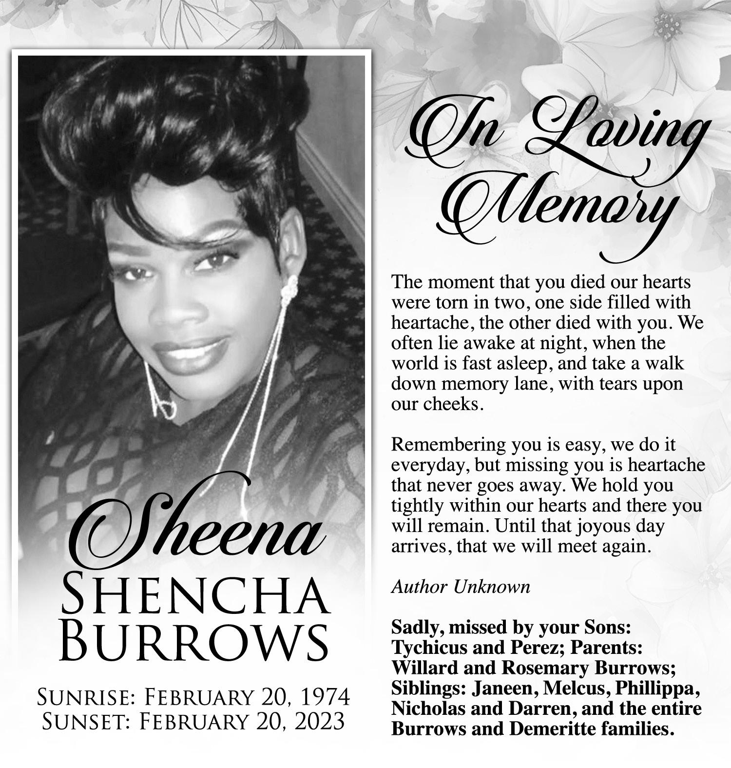 She is survived by her estranged husband: Joseph Burrows; children: Tara Ferguson (McKaiser Ferguson), Jetson Harvey and Adam Burrows; siblings: Gregory Williams (Lorraine Williams), Sharon Pyfrom (Wesley St. John Pyfrom) and Sophia Ferguson (Apostle Phalmon Ferguson Sr.); aunts: Marjorie Adderley, Louise Adderley and Julie Moxey; nieces: Alexis Ferguson, Lauren Pinder, Ashli Pyfrom, Earlene, Singie and Chrystal Fawkes; nephews: Phalmon Ferguson Jr., (Alexandria), Levant Williams (Petrina), Leron Williams, Jeremy Ferguson, Quinton Higgs (Angelique) and Clyde Taylor (Lynn); grand nieces: Arielle Williams and Azariah; grand nephews: Phaedron Ferguson, Quinton Higgs Jr., Rayden Clarke and Lemuel Williams; godchildren: Sasha, Sariah, Saschelle and Ryan; and a host of other relatives and friends inclusing: The Harvey family, Charlene, Janet, Michael, Derek, Trinard, Chelston, Derek Jr., Cionn, Maurisa, the church family of Faith United Missionary Baptist Church, United Faith Ministries International and many others too numerous to mention.