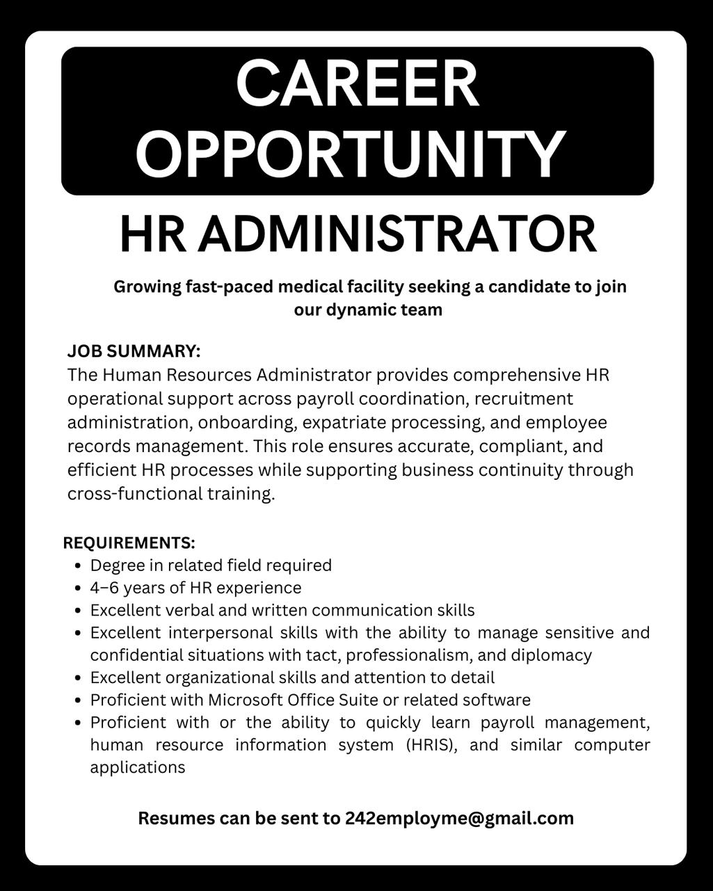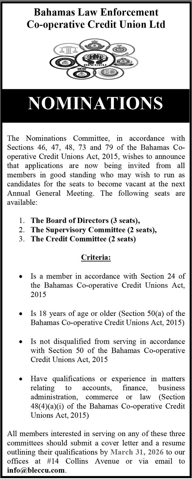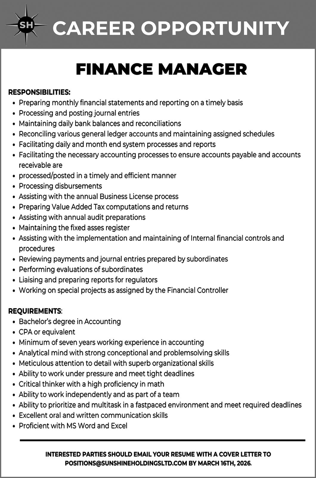Submit your cover letter and resume to CCEAU@BAHAMAS GOY BS and LESTERGITTENS@BAHAMAS GOY BS The application process closes March 2nd at 4:30pm. The Successful candidate should be able to assume the post in March 2026