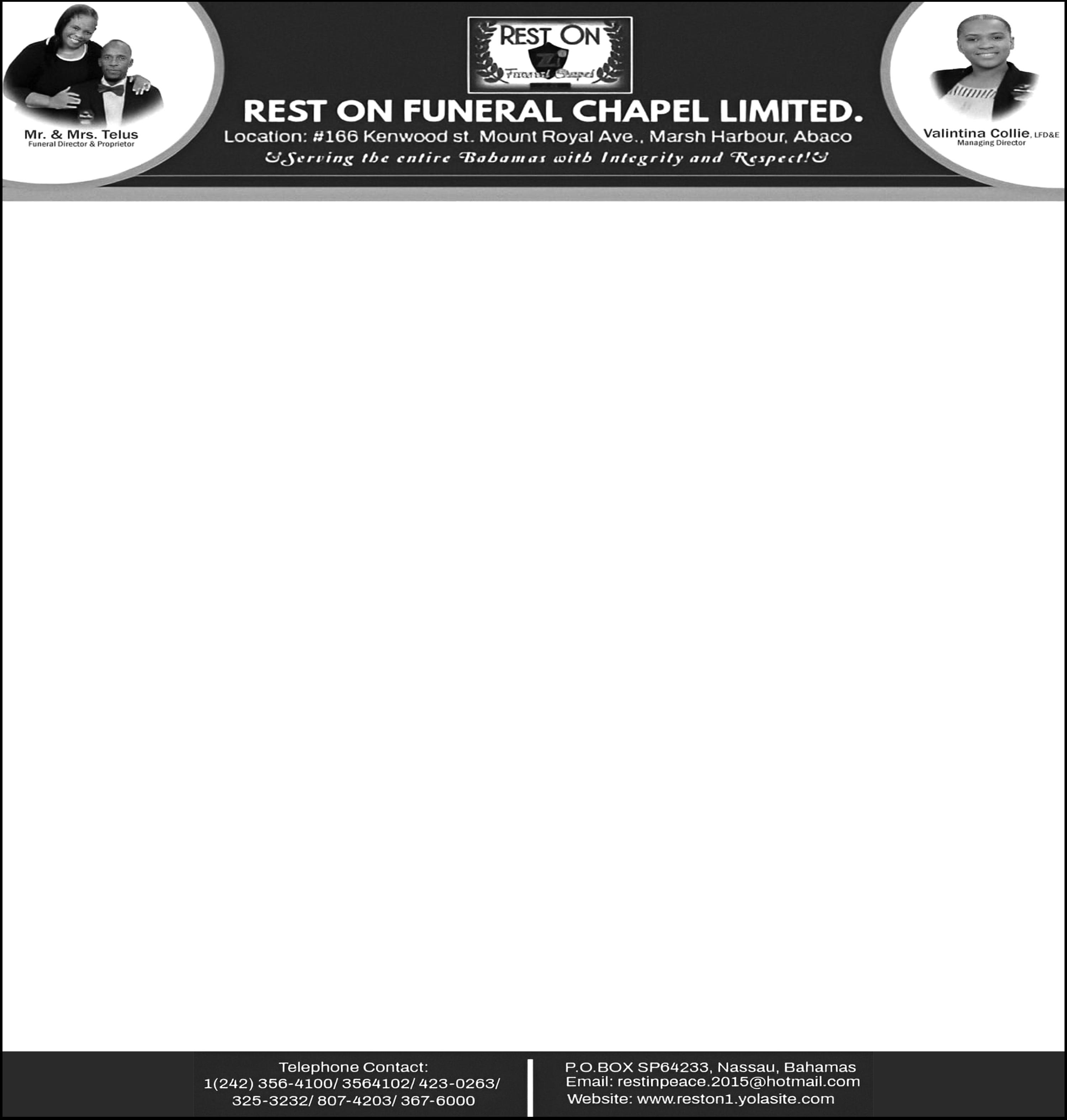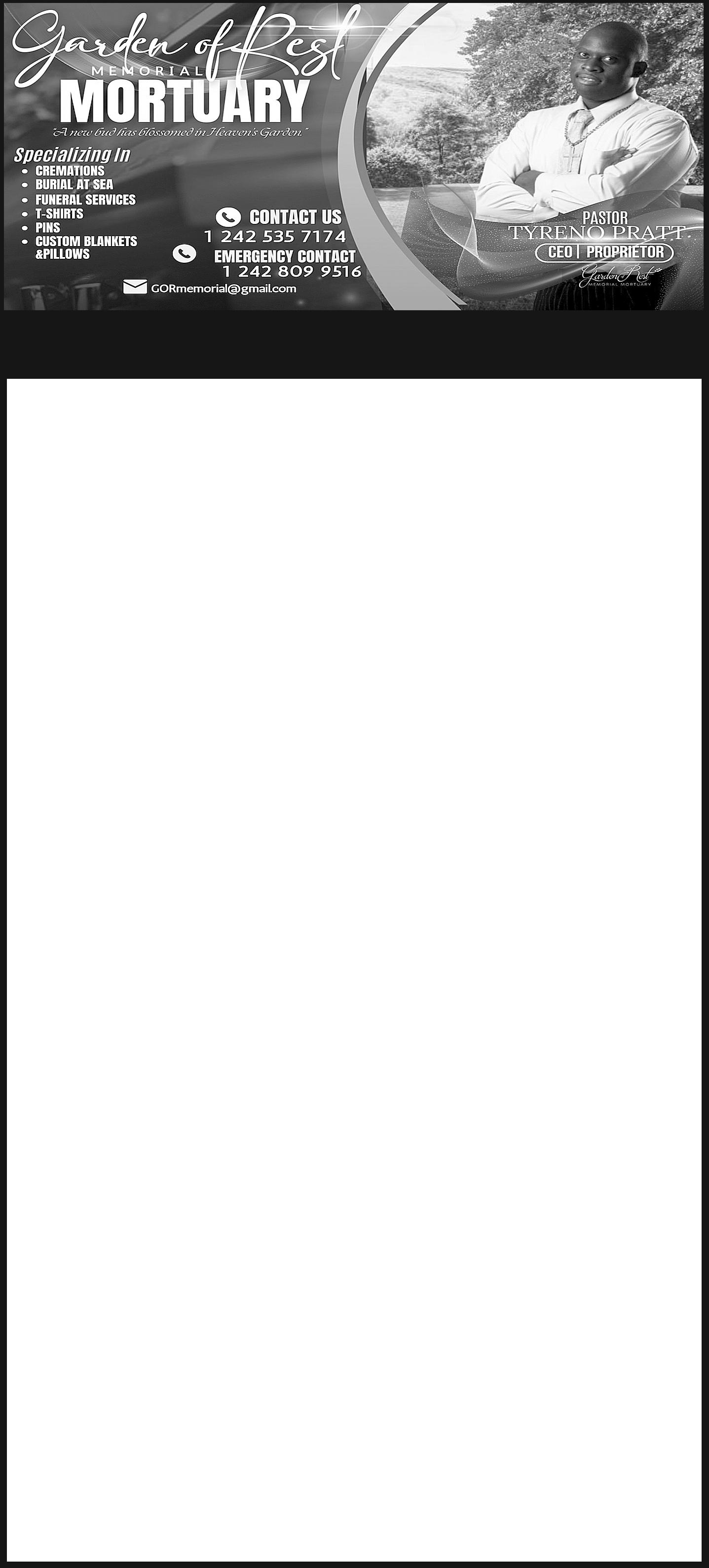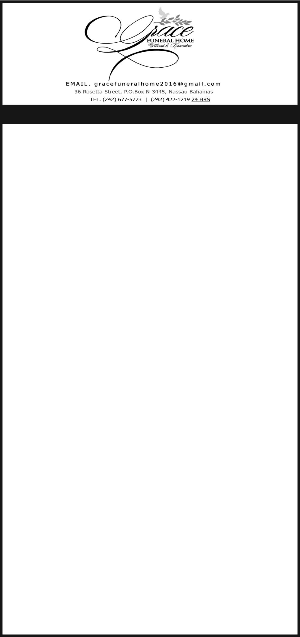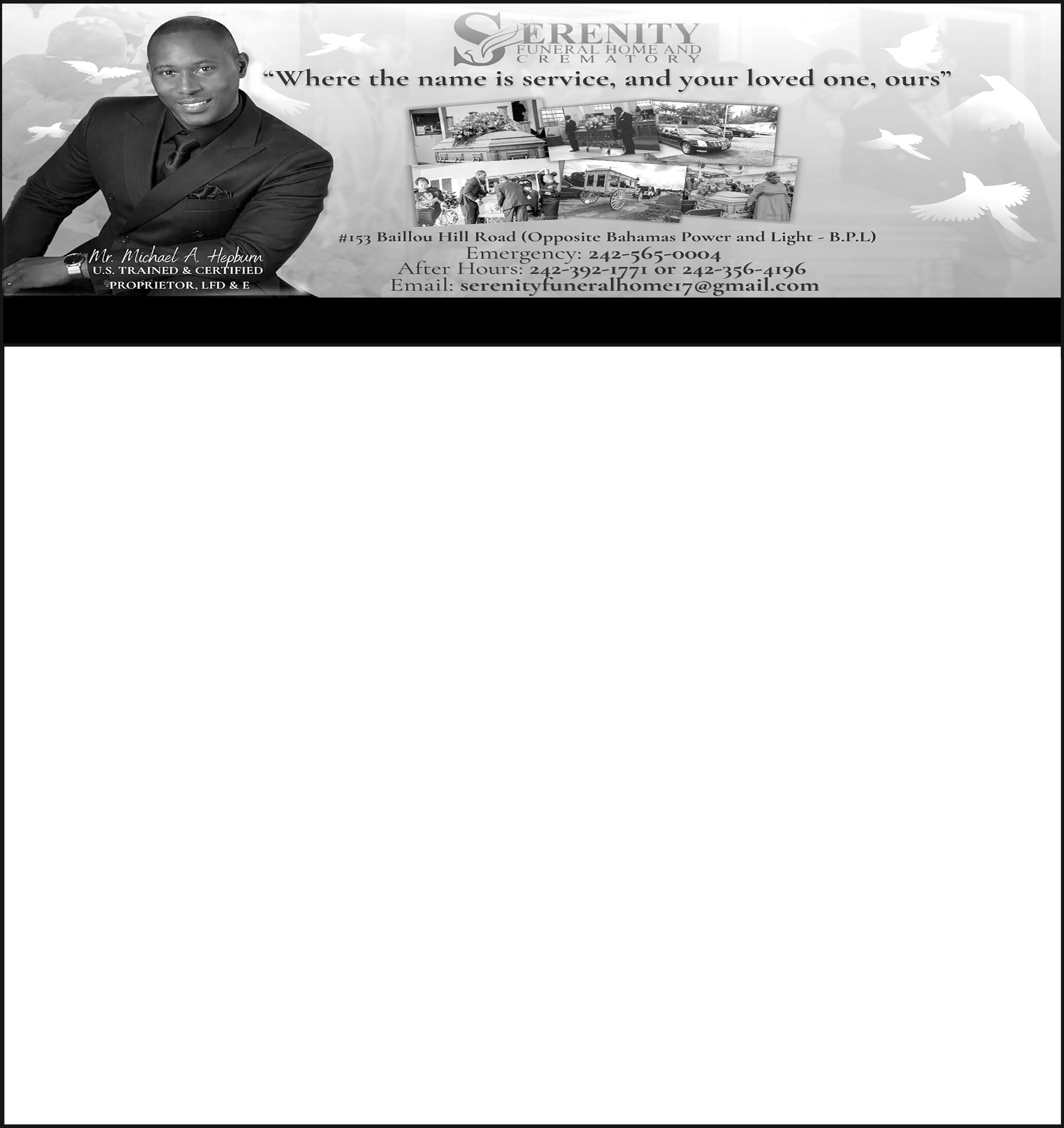 He is survived by his daughters: Lettieann Minus-Brown, Raynelle Minus, Mel MinusMontreuil, Carla Minus-Turnquest, Stacy Minus-Fox, Sheena Kemp-Massey, Renee Minus and Shanaka Minus-Poitier; sons: Kentworth, Kermit, Raynardo, Eric Minus and Kenny Hall; grandchildren, great grandchildren; sisters: Beverley Minus-Collins and Lerlean MinusTehada; daughters-in-law: Brendalee, Claudia and Tanya Minus; sons-inlaw: Lester Brown Sr., Jude Montreuil, Michael Turnquest and Shawn Fox; brother-in-law: Milo Tehada; numerous nieces and nephews and a host of other relatives and friends