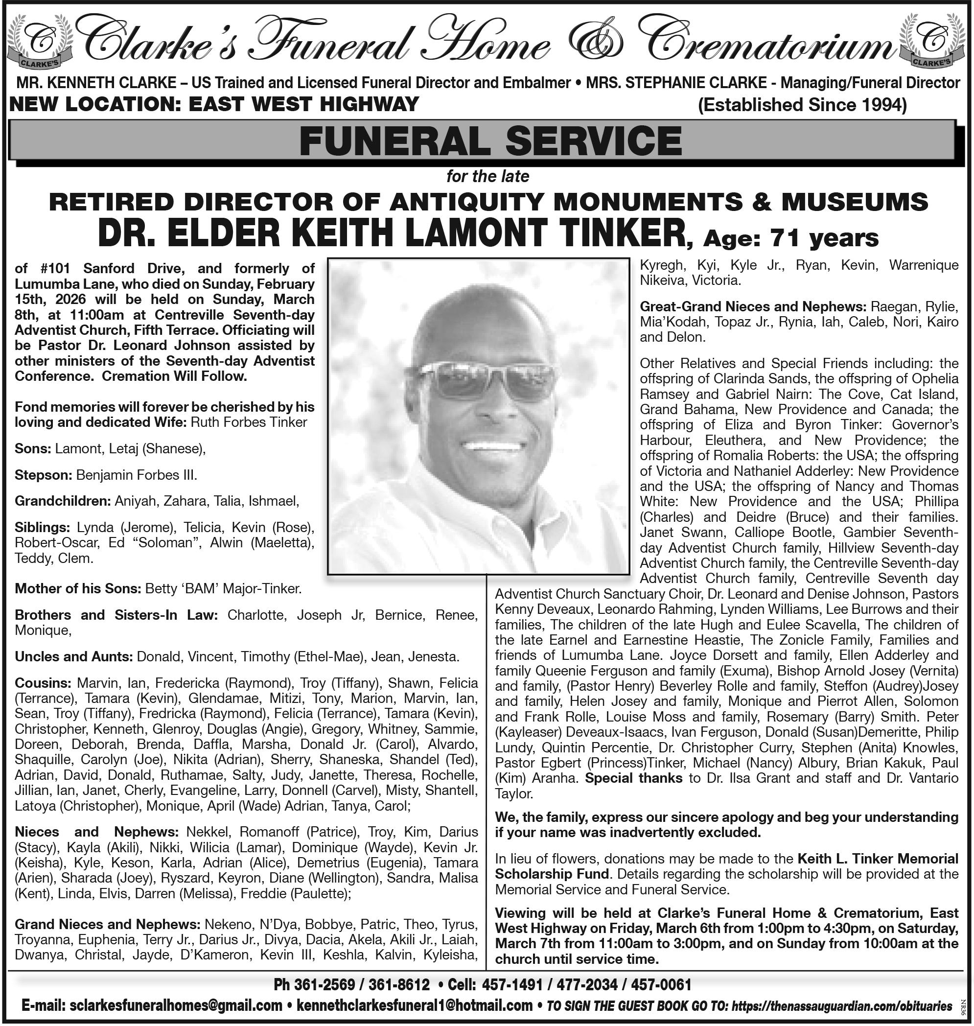 a resident of Fifth Street, Coconut Grove, New Providence, Bahamas who died at his residence on Friday, February 13th, 2026 will be held at 11:00 a.m. on Saturday, March 7th, 2026 at The Chapel of Memories, Independence Drive, New Providence. Bishop Ian Brathwaite will officiate. Cremation will follow.