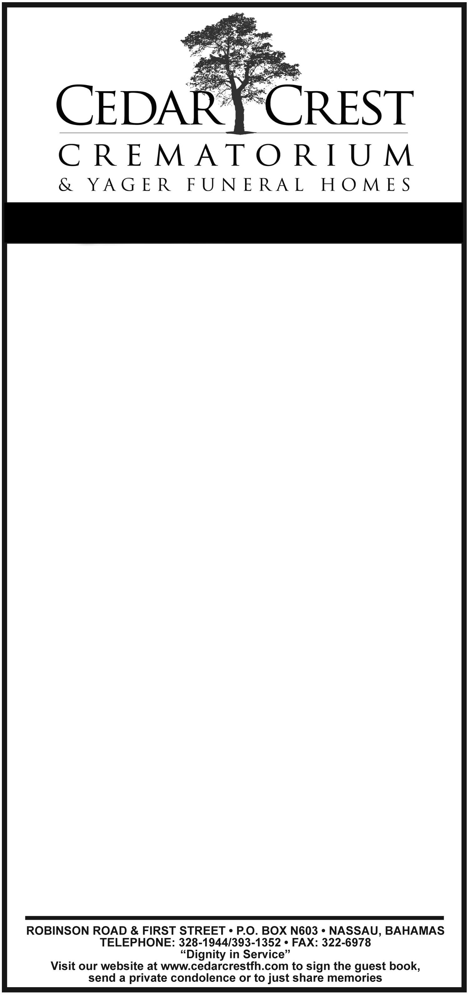 of Poinciana Drive, New Providence, will be held at 11:00am on Saturday March 7th, 2026 at Sacred Heart Church, Shirley Street, New Providence. Officiating will be Fr Devereaux King assisted by other members of the clergy. Cremation was held